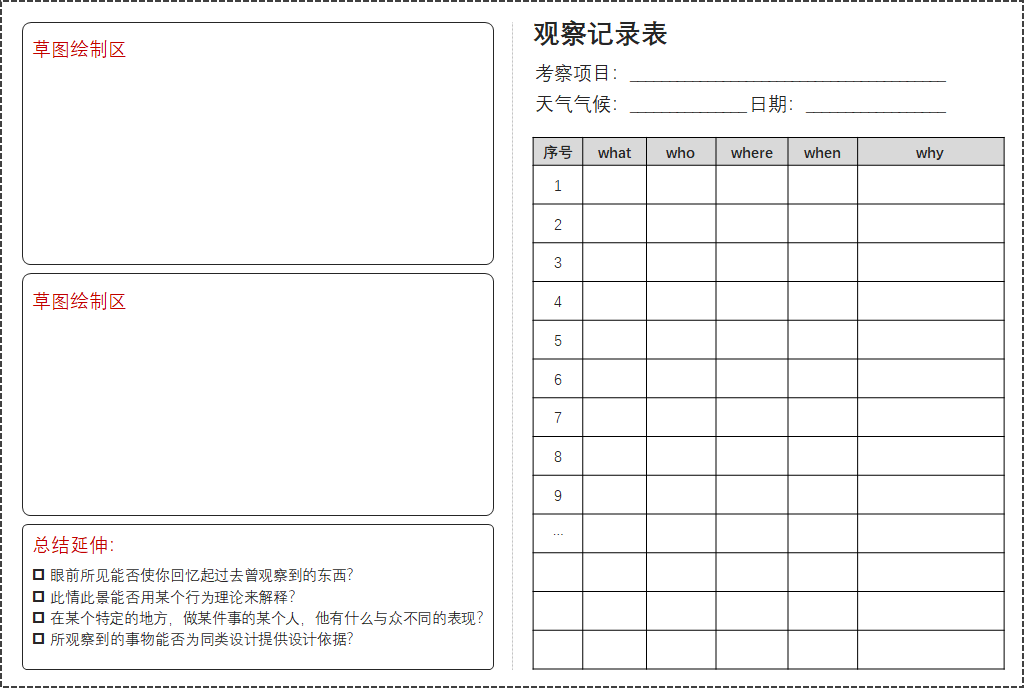 作者建议我们都应该有一份观察提纲和记录表,用来做现场记录这有助于培养我们的观察意识,否则匆匆一瞥,见到的东西很快便会忘记,对我们来说毫无意义。