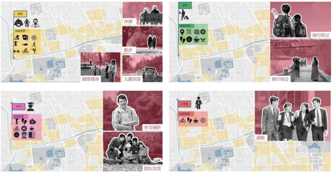在开启一项设计前,完善的人群分析一定是必不可少的环节,但我们大多数时候在分析人们活动时,往往带着程式化的有色眼镜。例如老年人的行为就是散步、康养,小孩子的行为就是游乐,上班族的行为只是通勤路过,游客的行为也只是骑行、赏景。