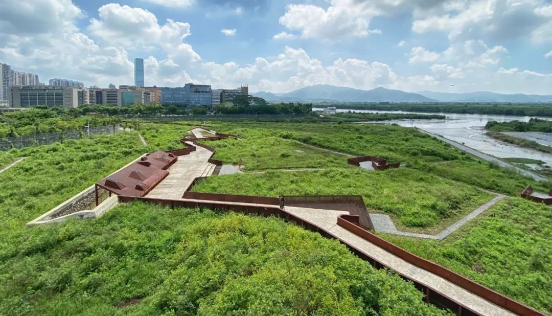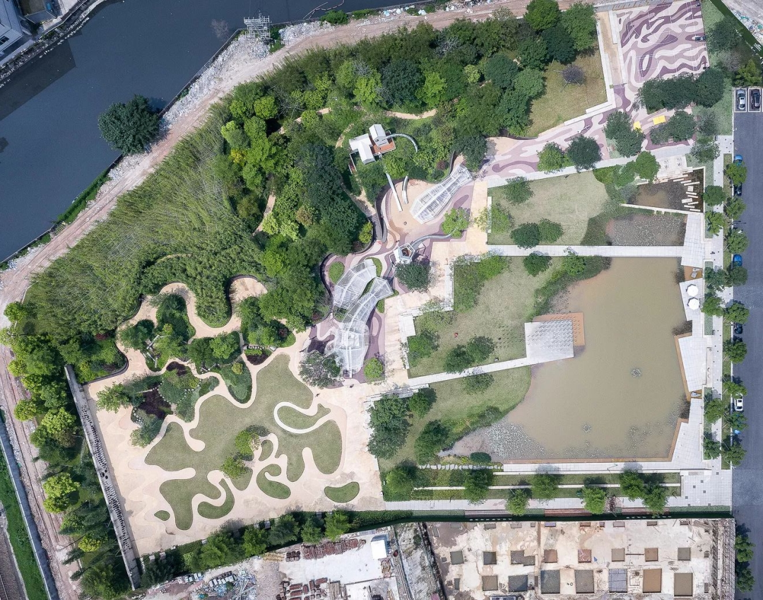 长沙山水间社区公园,内置了一套雨水收集净化系统,整套系统其实还挺复杂的,要模拟公园不同时段的降雨量,研究雨水怎么收集、汇聚,中间集水的湖面多大合适,还要考虑蒸腾和渗水量。下暴雨,水溢出去湖面的时候会有一个地下的蓄水箱把水收集起来,等到旱季的时候再把蓄水箱的水提出去灌溉回公园。同时,这套系统中的水也是在不停流动的,靠植物、微生物对湖水进行净化,保持全园拥有干净的水景观。