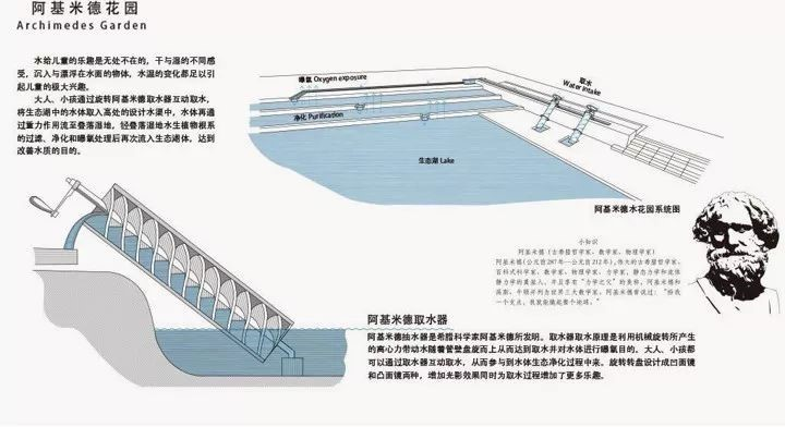 设计师甚至专门做了一个可以参与水循环的小花园——阿基米德花园。这里面有两个取水器,可以把湖水从比较低的地方提到比较高的地方去。水顺着水槽,在高的地方流一圈,流到植物区,经过净化,然后又流回到湖中。在这个过程中,孩子可以沿着水流动的方向,亲身观察水系统的运作方式;同时水质本身也得到了加速净化,一举两得。