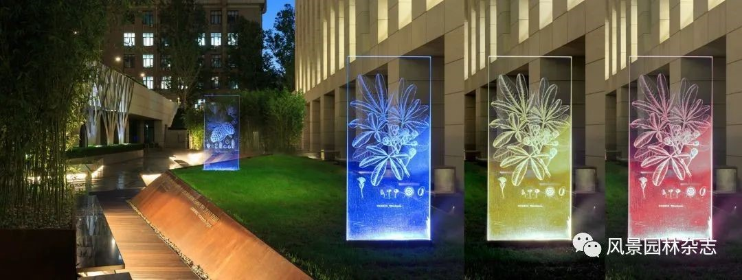 蔡凌豪老师曾给北林学研中心的下沉庭院,设计了几块植物玻璃展板,玻璃板底下有 LED灯,它会受到PM2.5传感器的控制,灯的颜色可以随着空气质量的变化而变化。要知道,景观区别于建筑,最大的不同在于它是有生命、可变化的,随着四季轮回,景观在不停生长。但这种变化是非常缓慢且滞后的,养死过植物的都知道,当它缺水时还在抽新叶,如果没仔细观察,晚几天再浇水,植物一夜之间就可能枯萎。而借助灯光的互动,自然环境的细微变动,都可以在景观中被实时地呈现出来。