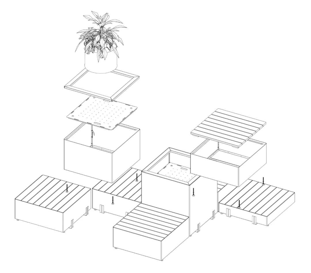 “PIXELAND像素乐园”利用模块化的方式,将不同的户外设施组合在一个整体空间中,如植物景观、儿童游乐设施、成人休闲设施等。每个四方小格,都是一个独立的功能模块,既可以单独使用,也可以组合出无穷多有趣的多功能公共空间。面对同质化场地,和边角废弃场地,像素乐园都可以提供令人惊喜的解决方案。