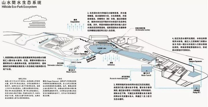 一般来说,雨水净化系统是不可见的,但设计师非常希望能够让人看到,使其成为一项自然教育产品,引导人们互动参与,意识到景观不只是环境的装饰。如果家长带着小孩住在这片社区附近,他们去公园玩的时候,家长可以对照着解说,给孩子讲讲公园的水系统是怎么回事。