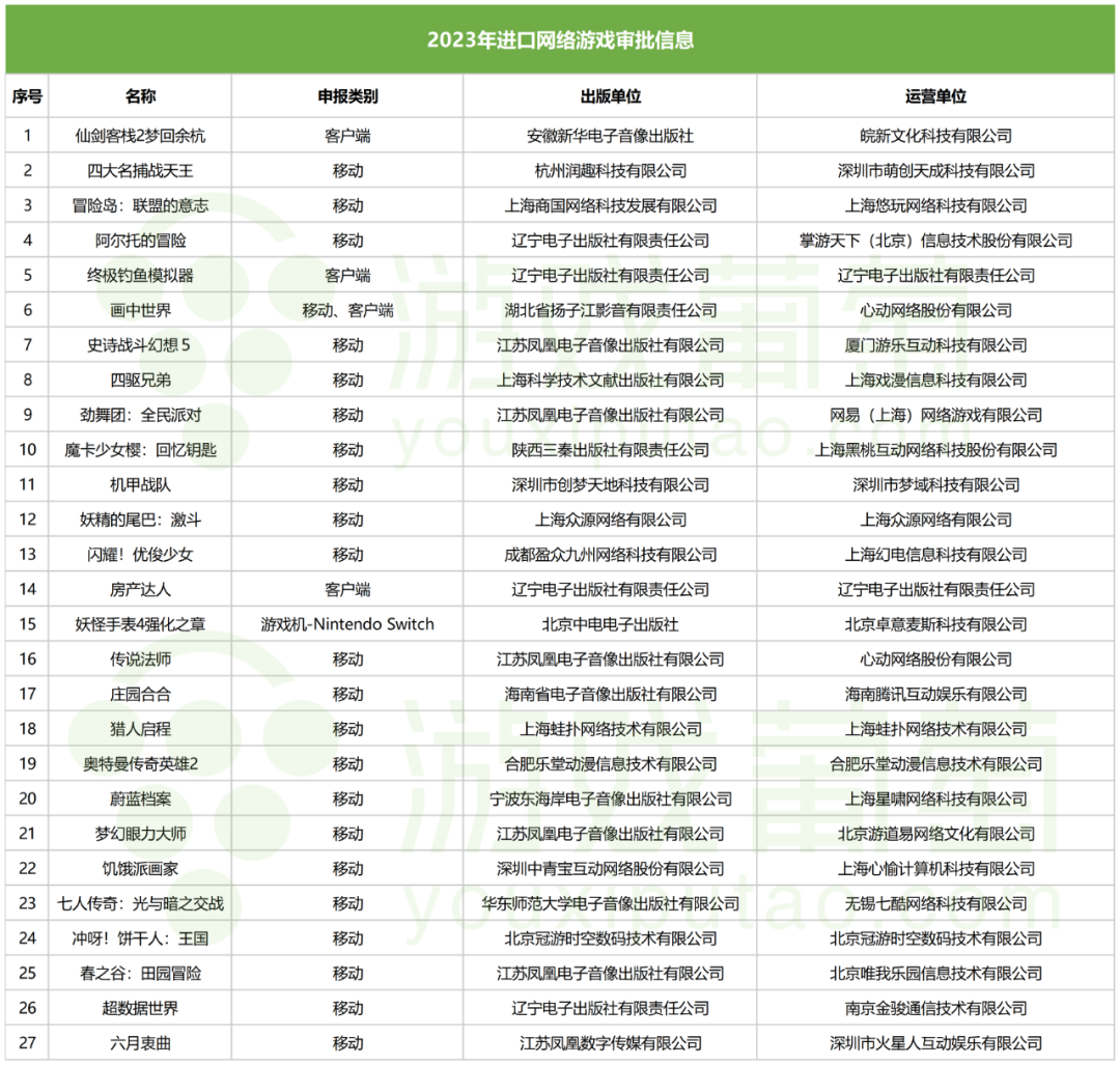 3月20日晚,国家新闻出版署公布了2023年进口网络游戏审批信息,共有27款游戏过审(文末附有完整名单)。