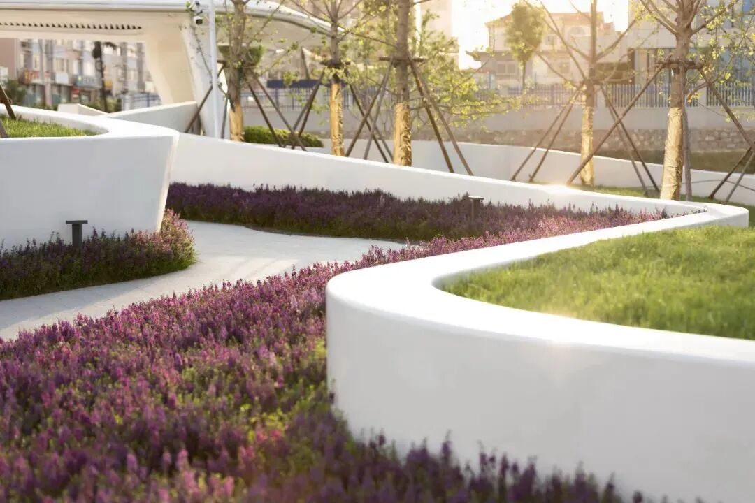 座椅、树池、观景平台、景墙等景观元素与边界结合,让边界景观具备一定活动功能,人们可以驻足、观赏、休息,让边界空间因与人的交互活力四射。