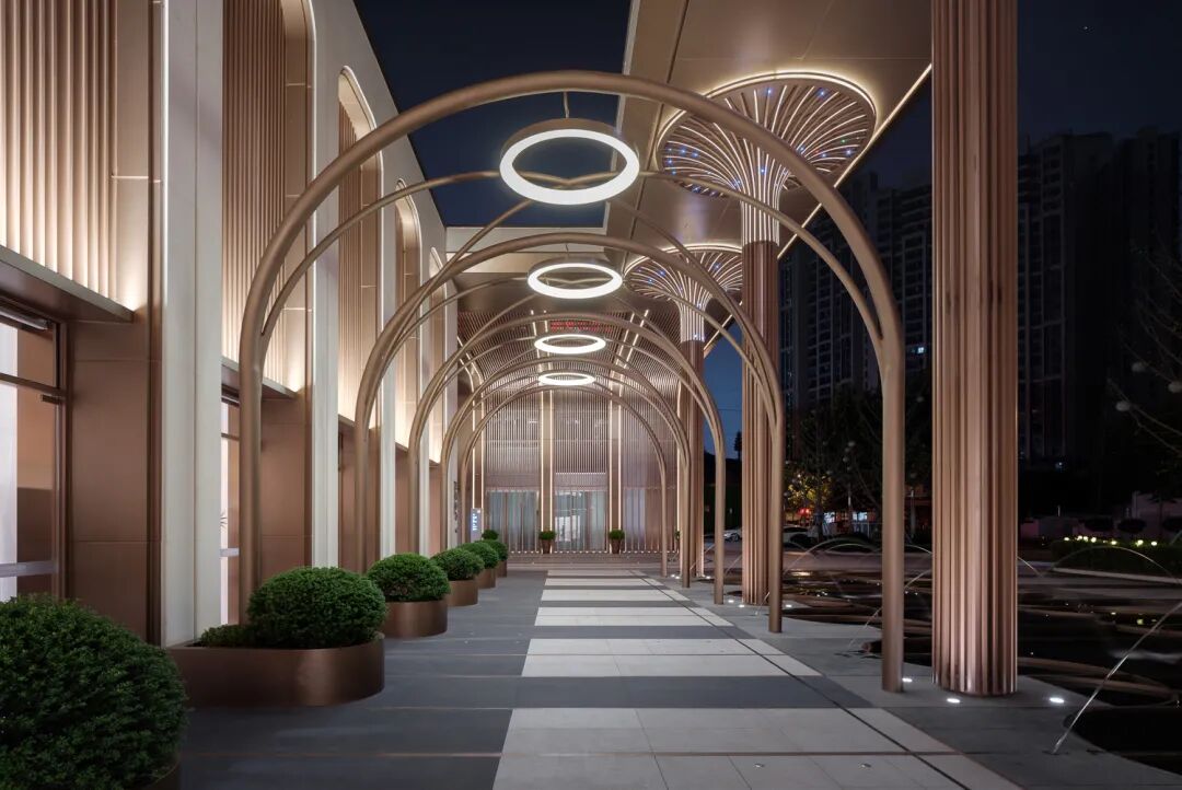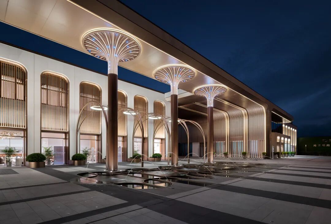 三根仪式灯柱呈扇形支撑上行空间