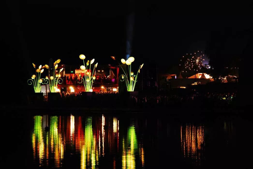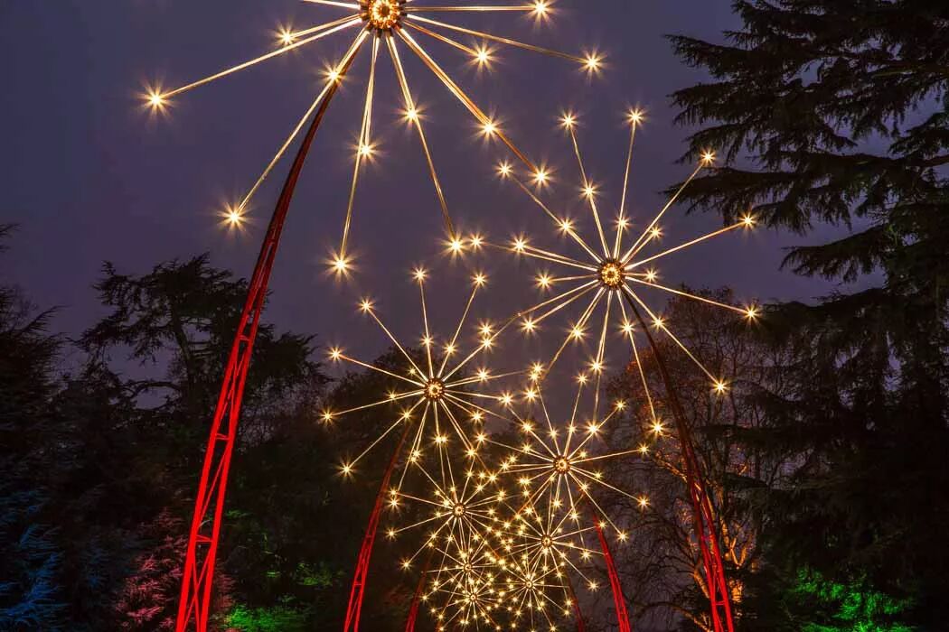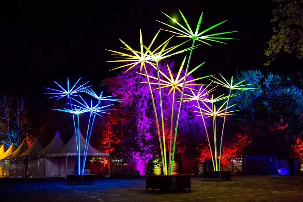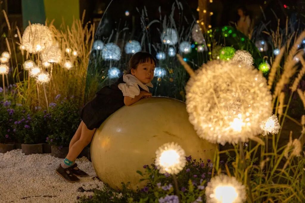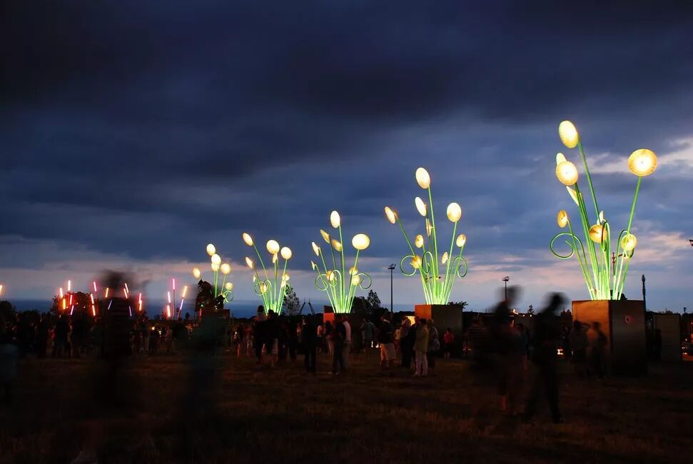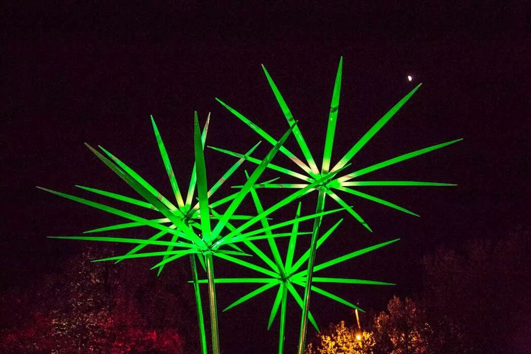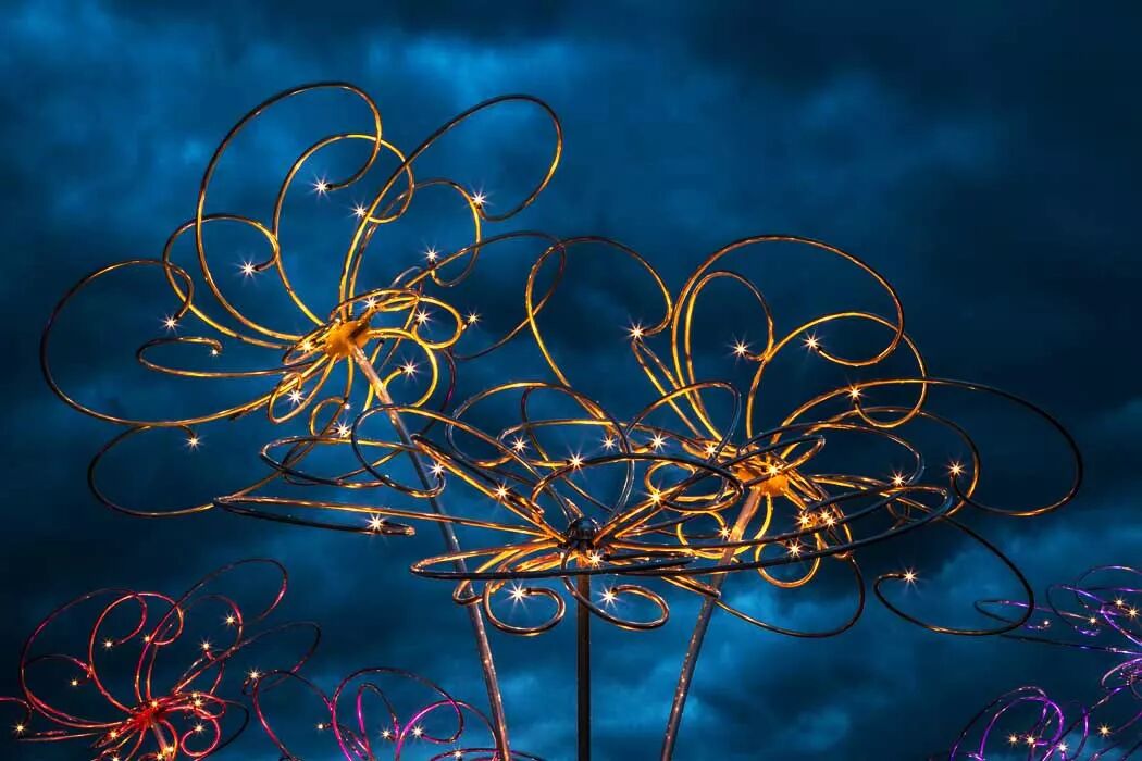 其中九根茎顶部装有发光的遮阳伞,在暮色中发光
