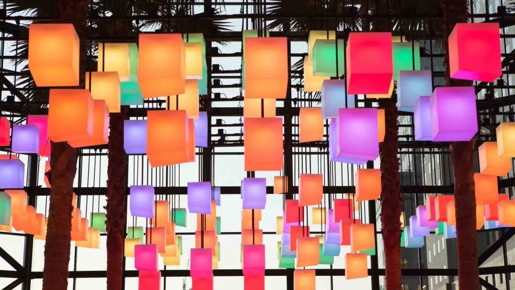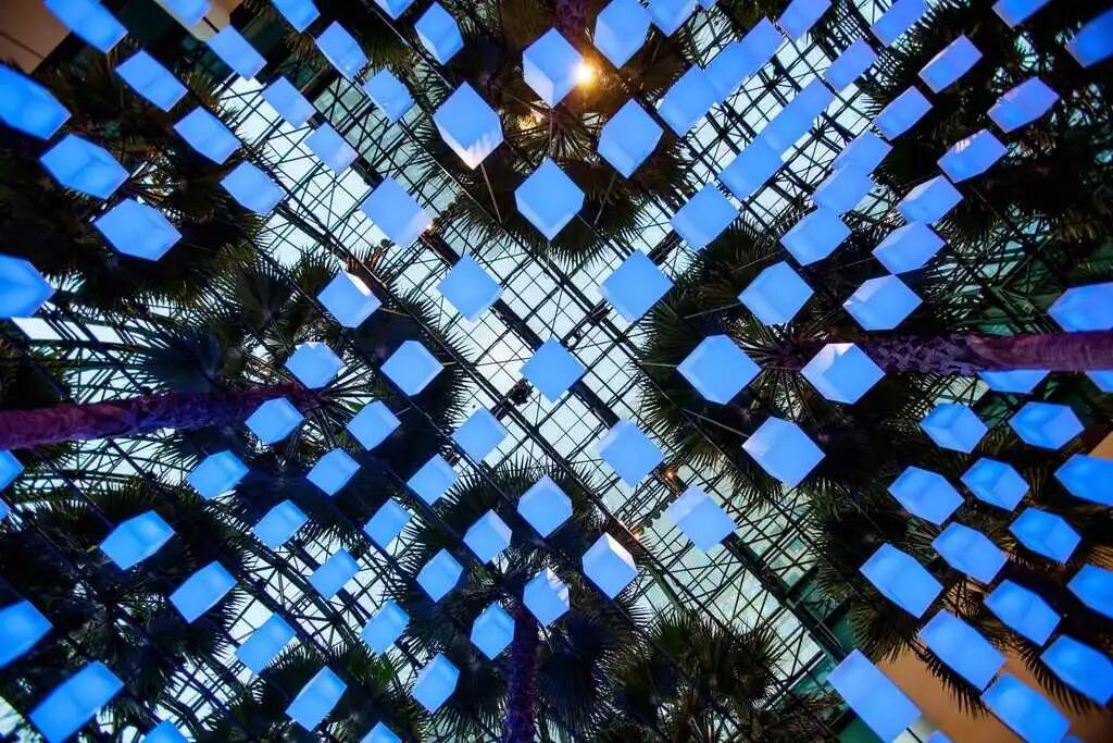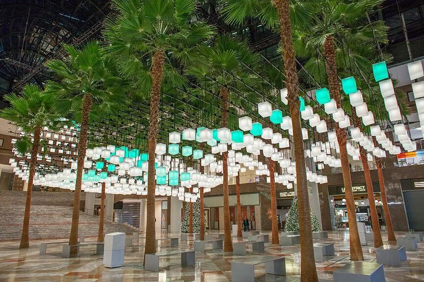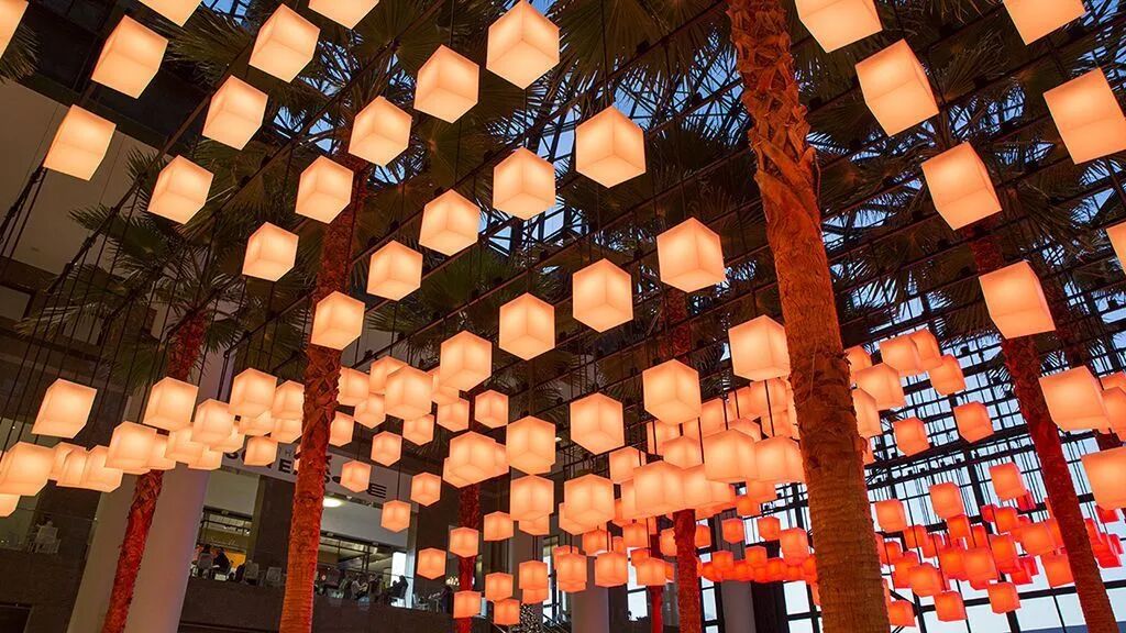 Luminaries包括三个遍布中庭的许愿站。这些白色的、发光的、触摸敏感的人造石站点邀请游客许愿,并响应他们的触摸。愿站将把愿望“发送”到上面大约650个闪烁的灯笼的树冠上,将愿望转化为一个迷人的灯光色彩展示,这些灯光色彩在灯笼中穿行。愿望的互动和集体行为创造了一种共同的庆祝传统。此外,壮观而精心设计的灯光表演将会全天安排。