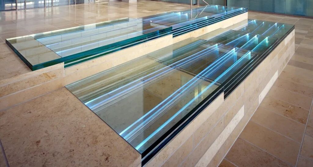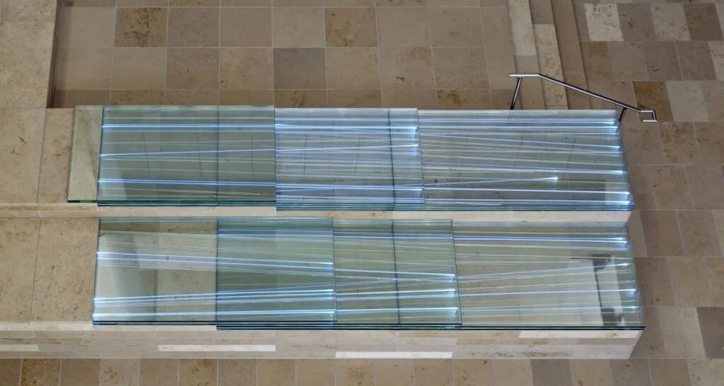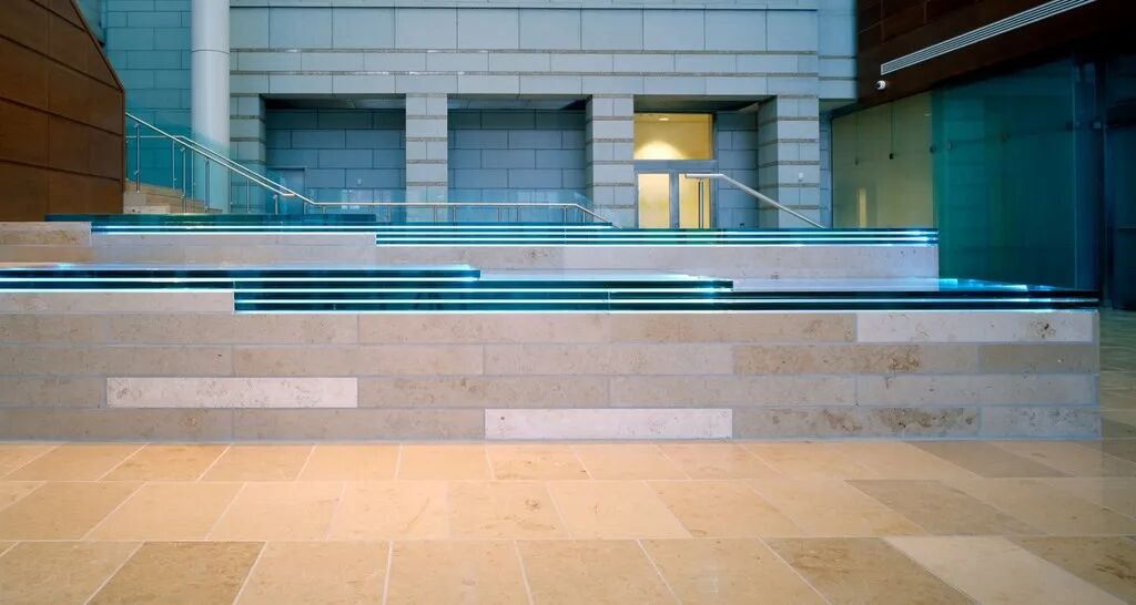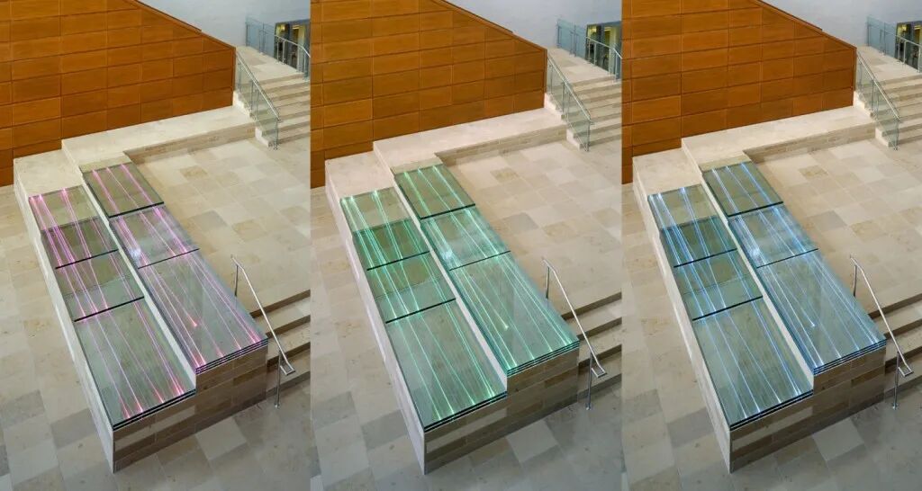 这个入口庭院将主入口楼梯的设计与主平台的灯光和玻璃融为一体颜色从蓝色到绿色到紫罗兰色不等,为这幅环境作品提供了流动和变化的环境。光纤束被层层叠放在台阶状的石灰岩台板上。