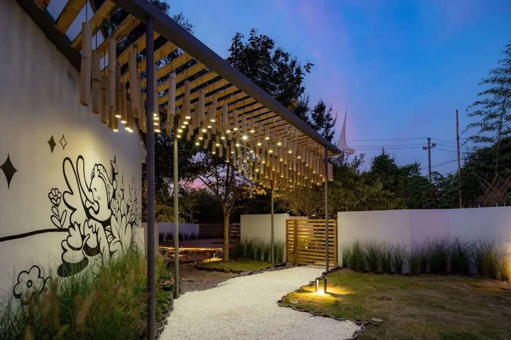外围的白墙中有相应地置入木格栅,使整体虚实相生,当暮色降临,洗墙灯与内院灯带亮起,立面显得更为简洁纯净。地面的铺设采用白色砾石,使整个空间都呈现出高级的品质感。