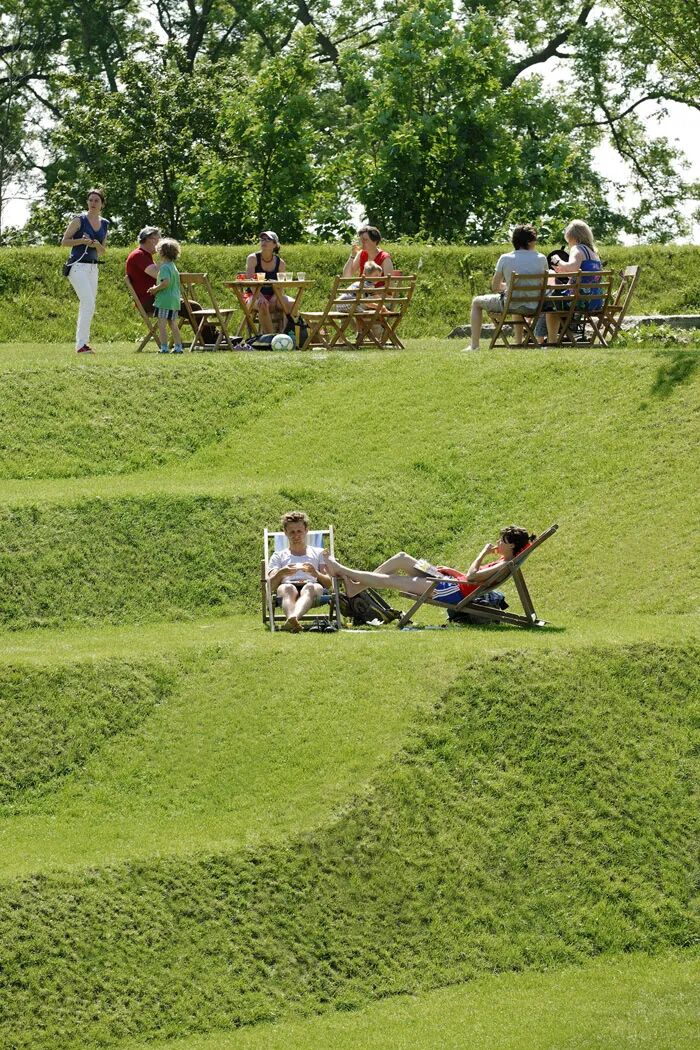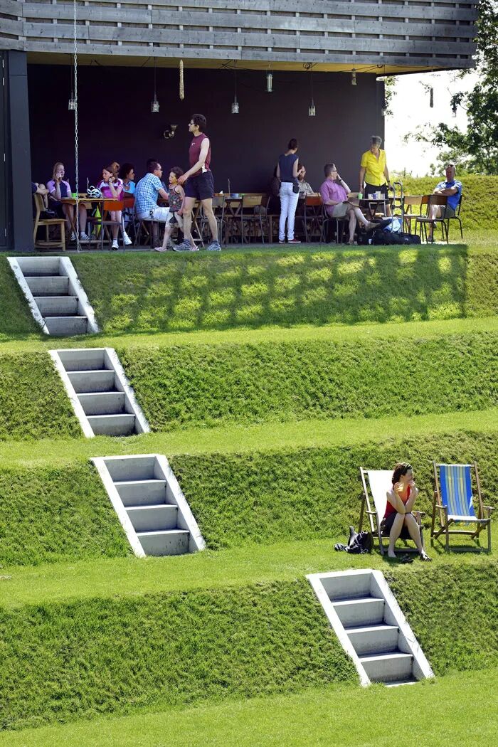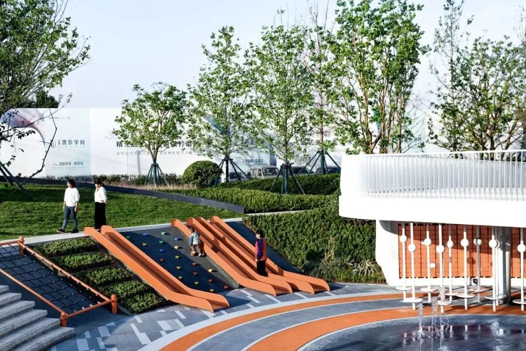 此时多样化的设计,可以有效而充分利用空间,台阶、斜坡、休憩平台,甚至是滑梯、沙丘、游乐设施都可以被充分利用。
