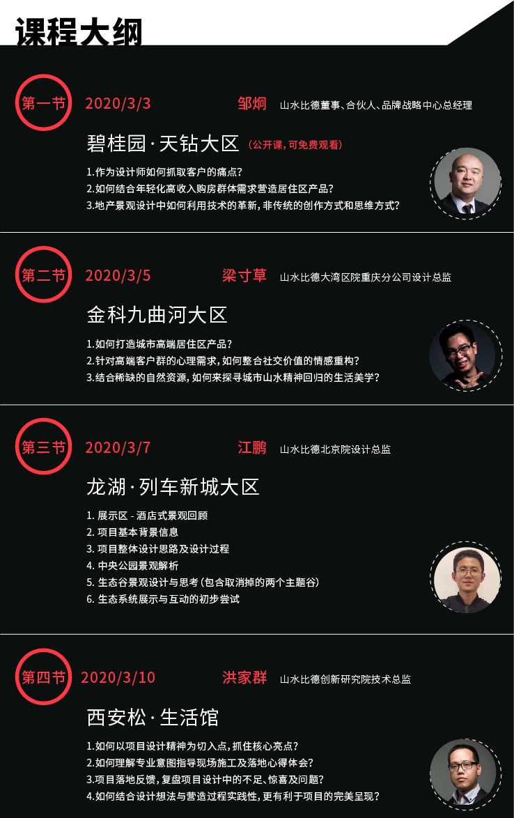 涵盖:地产产品力复盘、方案设计实战、景观的多维连接、园林植物设计、生态海绵城市、景观设计方法论、酒店设计、施工图后期、方案创作软件等景观相关全方面课程,赋能设计师。可通过手机、电脑、电视投屏随时观看。第一节均为公开课,支持免费观看。