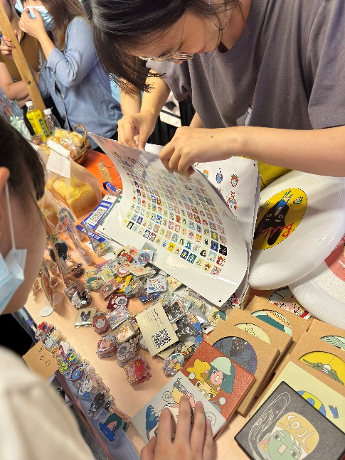 我们进行了一番选品,然后设计并找厂家定制。比如飞盘,挂布,T恤,立牌夹,手账夹,贴纸,徽章等等。在国庆当天东西刚好到齐了下午晚上开始摆摆摊售卖了。我们主要目标人群是青年群体,觉得这些艺术和设计会让大家有共鸣。但有可能我所在的城市是三线小城市,当地年轻人对我们这些艺术周边兴趣不大,不用任何宣传能吸引到的就是小朋友中小学生。所以我们就跟这群孩子们互动玩游戏,比如猜这个人是做什么的,那个是做什么的,讲每一个小头像的故事。