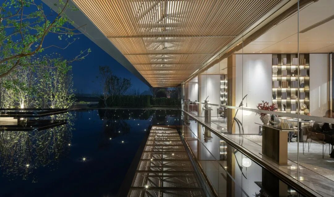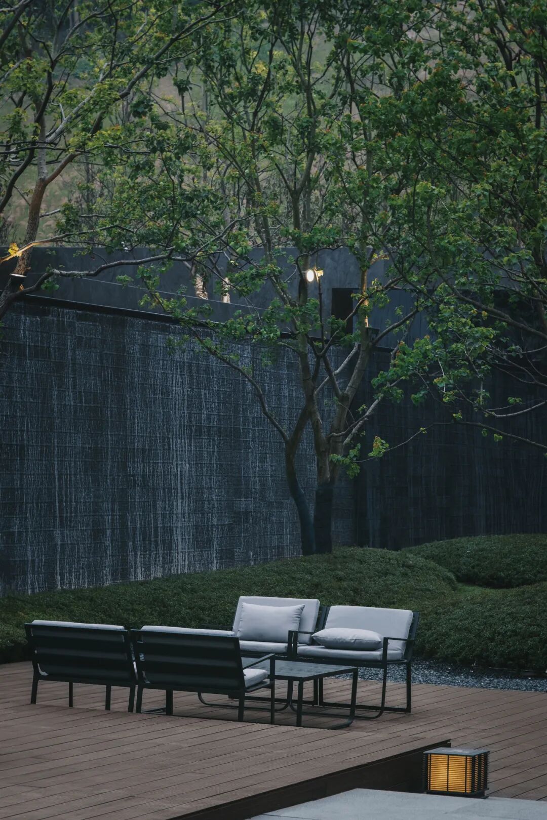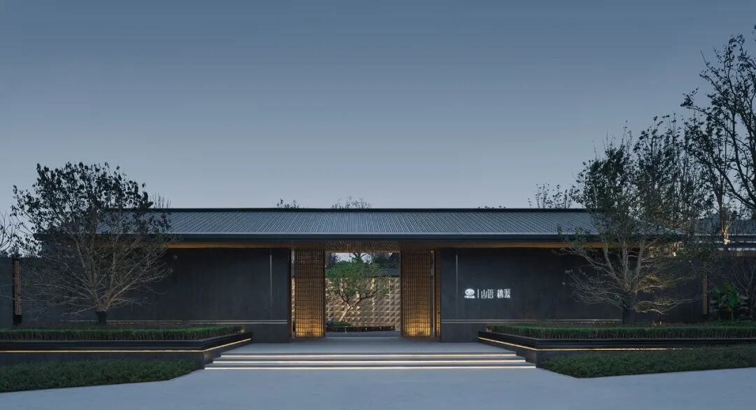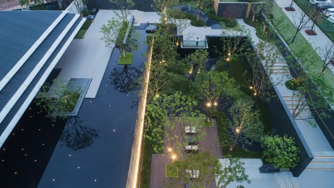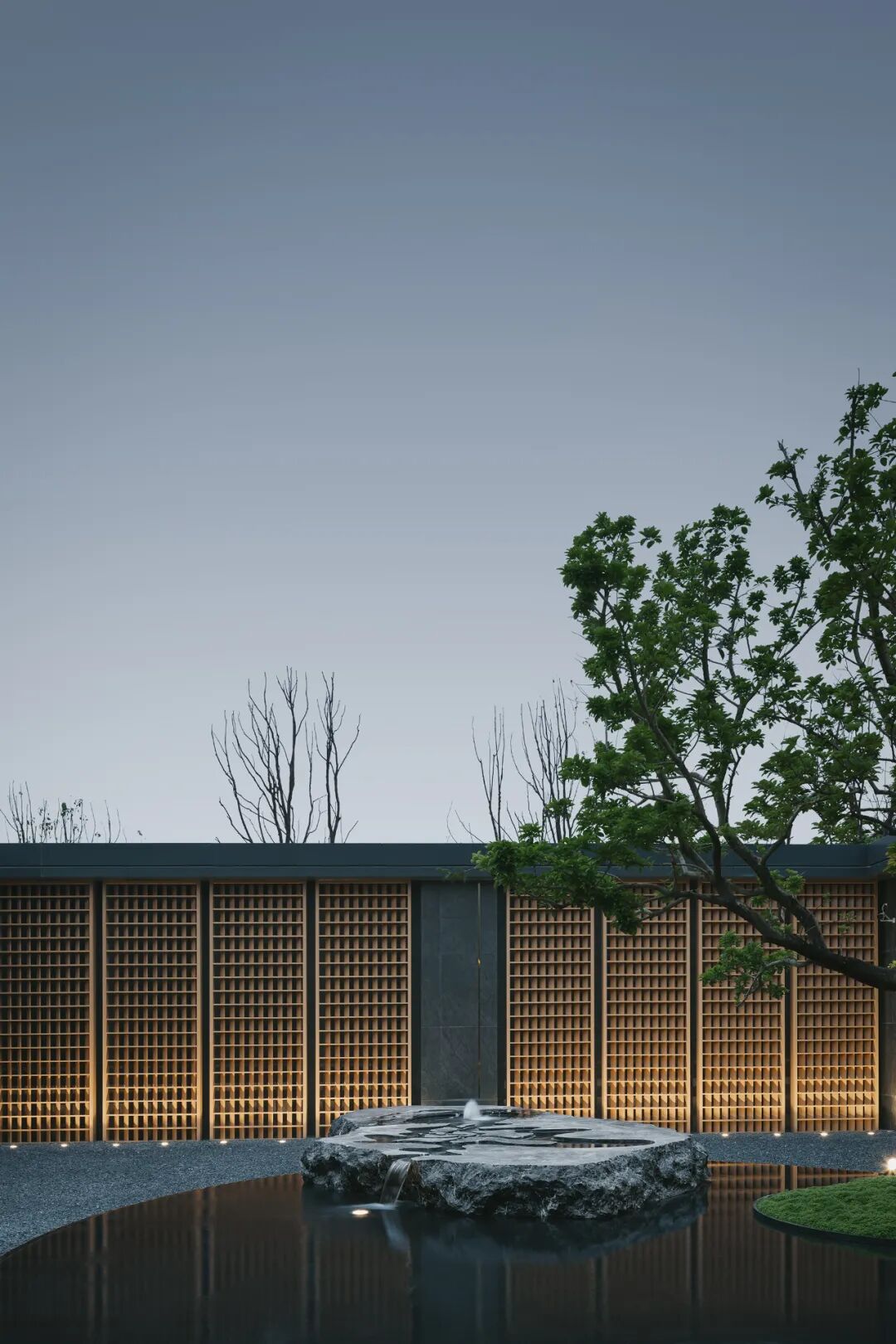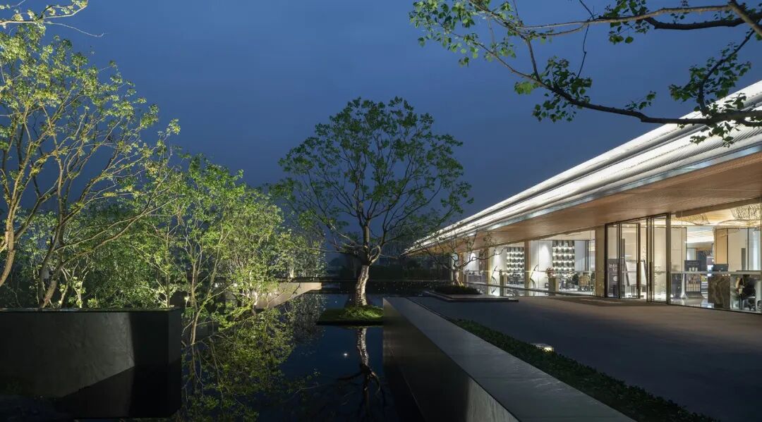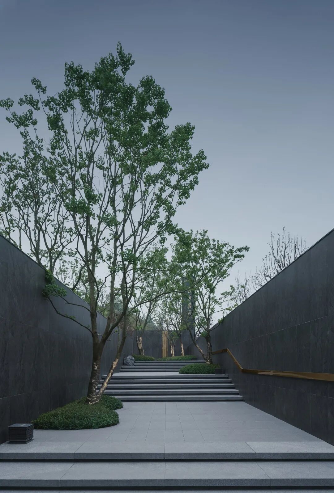 项目提取中国传统书院印象,通过形体、材质、肌理和色彩等元素,赋予其书院场所精神。场地高达3米的地势差,被充分融入层层递进的景观空间中,提供了立体式的观景维度,丰富了行进体验,同时为售楼部提供了纯粹而静谧的观景视角,免于外界干扰。