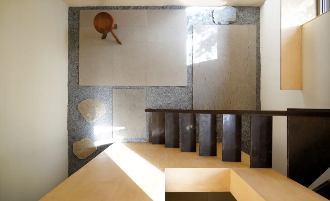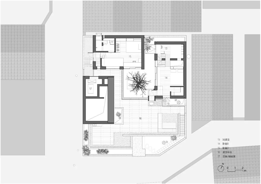 中庭是各个生活空间的景观视觉重心,其中的枫树伸向屋顶平台,为不同高度的室内外空间形成丰富的景观体验。建筑体量本身和庭院中的树木形成在平台远眺群山视线的前置景观, 遮挡了周围的嘈杂环境。通向屋顶平台设置了室内外两条公共流线和一条属于姐姐房的室内私人流线。根据各自生活习惯的不同,可以选择避免互相打扰的流线方式。