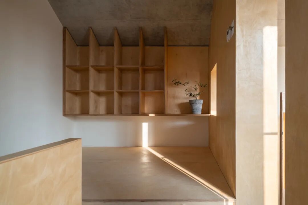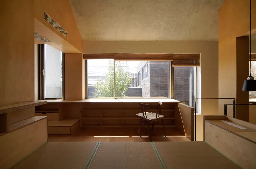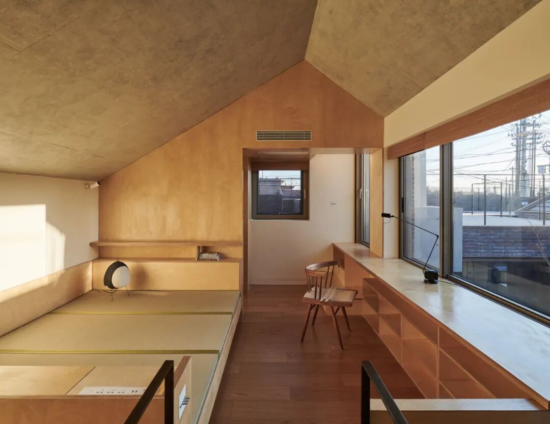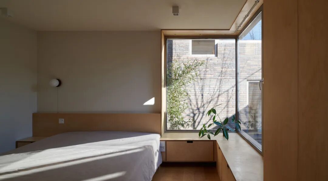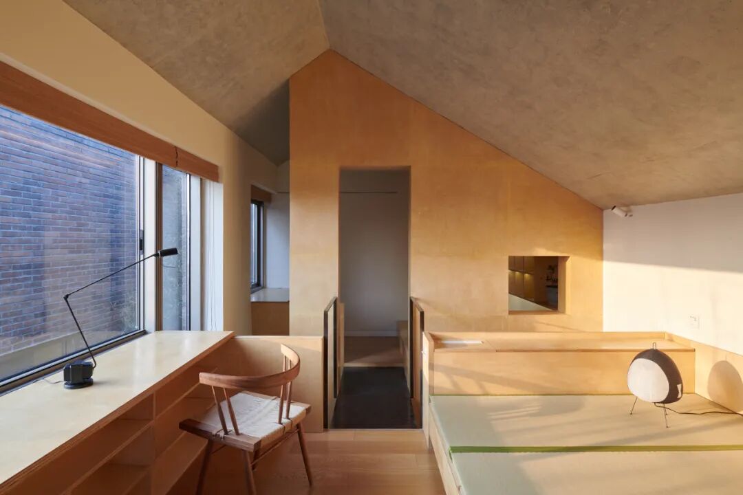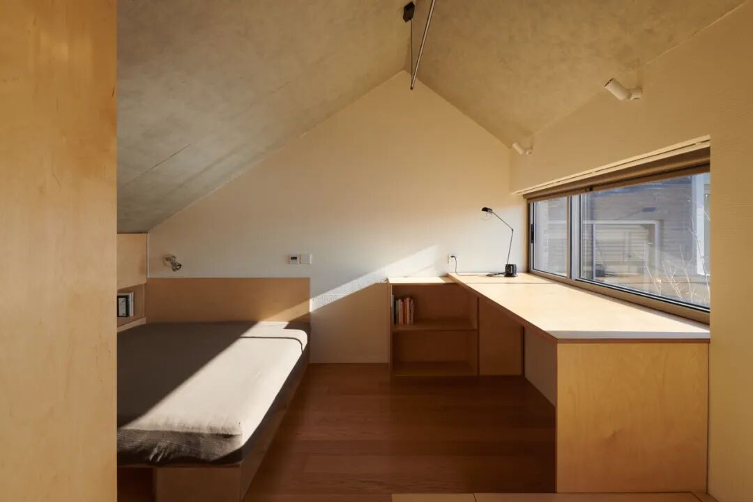 为便于照顾父母的日常生活,妹妹房临近父母房,其推拉长虹玻璃立面面对与中庭并置的景观走廊,可有选择地开启,让内部空间向外蔓延,与公共空间和父母生活空间建立物理和视线的互动。侄子的房间位于父母房的楼上,由于当地建筑高度的限制而顺势形成了如阁楼般的空间形态,书桌前的视野穿过庭院和屋顶平台向南延展。