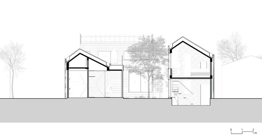 姐姐家庭的居住空间相对更加独立,除卧室外,设置了私属的会客厅、茶室以及阅读室, 以丰富假期生活的体验。整栋空间下沉 0.9 米,获得内部空间高度的同时与庭院建立立体的视线关系,内部的通高山墙立面在建筑中起结构作用的同时,在一层划分会客厅与茶室的动静关系以及光线明暗控制,钢楼梯攀附于其上,在二层延伸为架接阅读室与卧室空间的连桥。