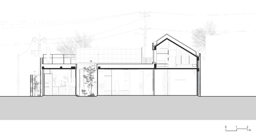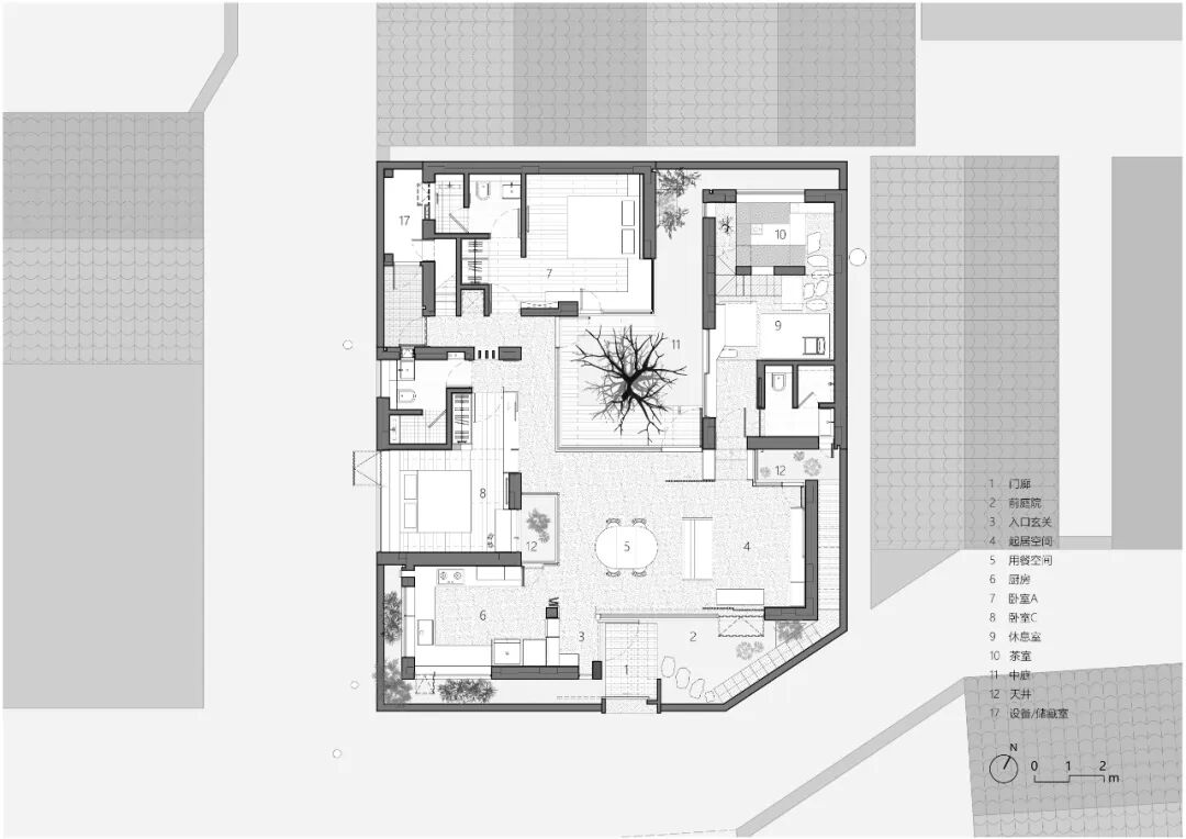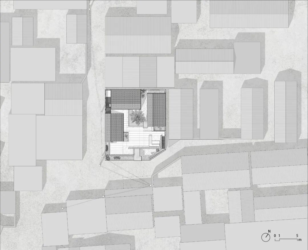 庭院是生活向自然溢出的部分, 也是自然向生活的渗透。院墙高2米,是厚实的表皮,界定场域范围、保护内部隐私。前院、 中庭、 两个天井和若干边界庭院在表皮和内部空间之间渗透, 表皮也因此与建筑体量时而融合、时而剥离, 为室内空间创造更充分的开放机会,为在其中的生活提供通风、采光和四季流转的景观营造。