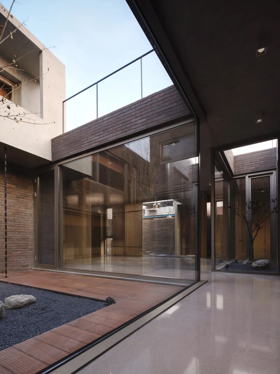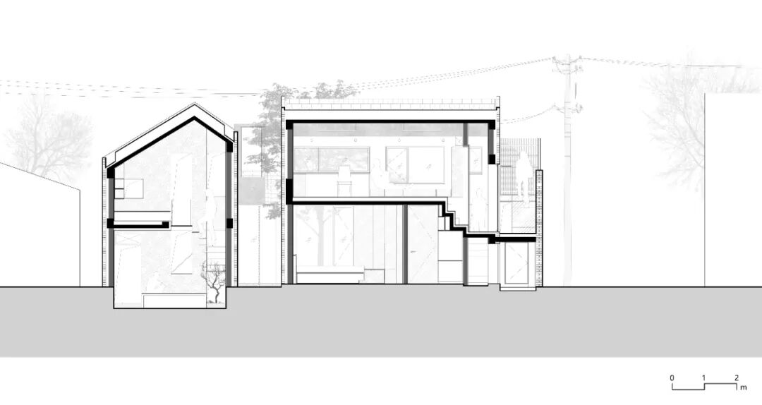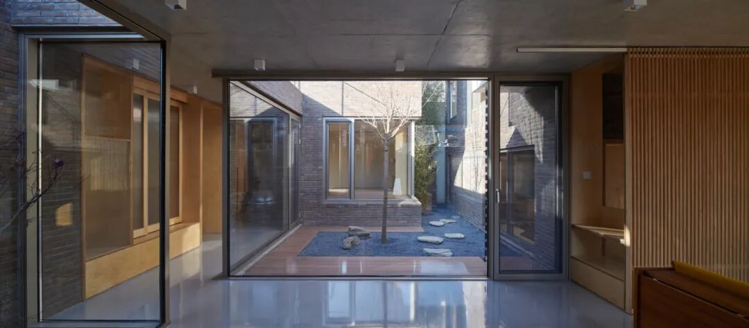 前院连接院门至入户,其中消化了基地东南的斜切转角,砖筑楼梯延伸自院墙,通往屋顶平台。客厅南北两面通透的落地玻璃门窗将前院和中庭的景观引入室内。东西两侧的天井为两个临近客厅的卧室空间与客厅空间之间提供了自然景观的介入,以虚空间的模糊性转化私密和公共的对立关系,消解封闭而产生共享,让边界对家庭产生更积极的意义。