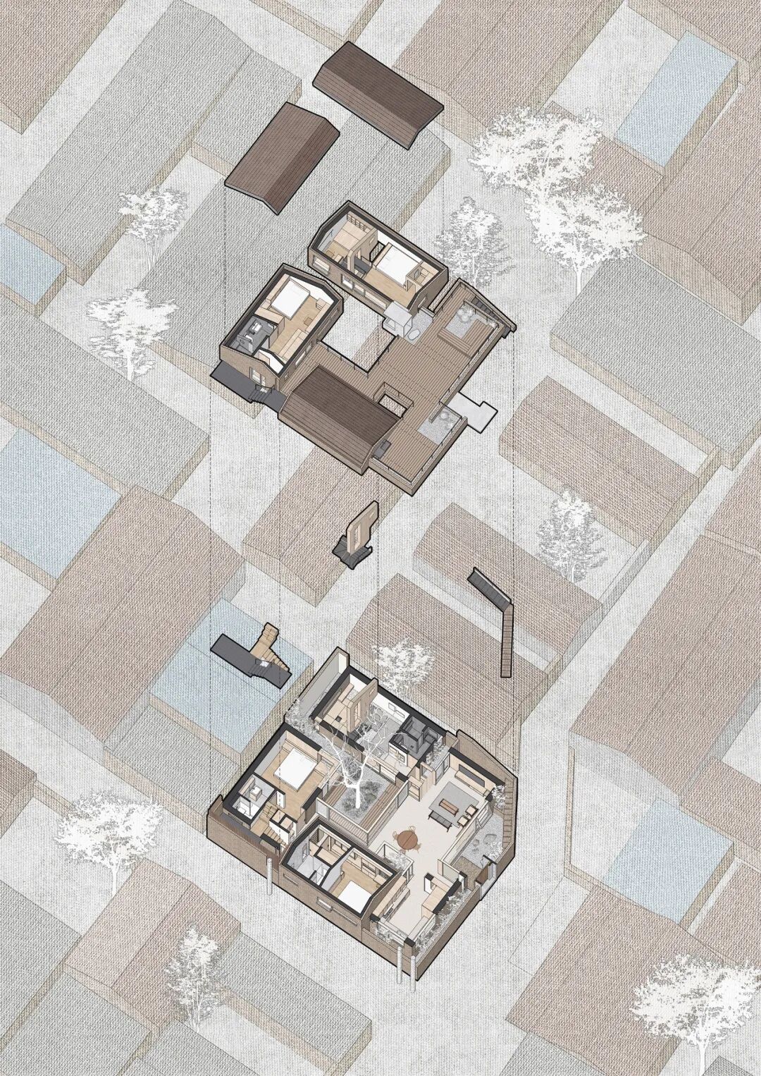 在这个住宅中,小家庭之间相互独立却又形成一个整体,边界看似模糊却又被清晰定义。我们希望通过建筑设计,在维护小家庭的独立性格和家庭之间合理边界感的同时,营造尊重和共享的群居生活氛围,消解对立而产生积极的可能性,满足个体对于家族亲情的诉求,让家庭自然产生更多的凝聚力。