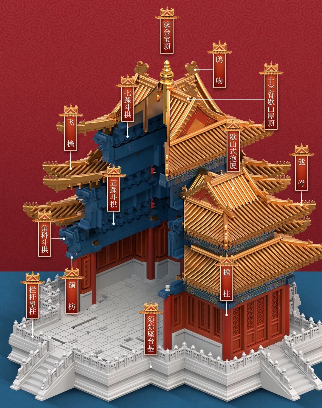 整个角楼,层层叠加,加上最后的鎏金宝顶尾部设计的十字形锁扣。