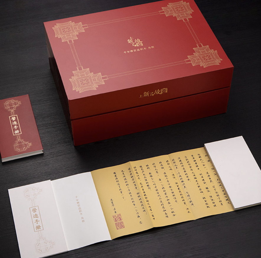 角楼积木采用了高端中式金丝绛红礼盒,配以奏折式的营造手册,非遗大师王震华亲笔手书,可当作为典藏或者馈赠都是不错的选择。