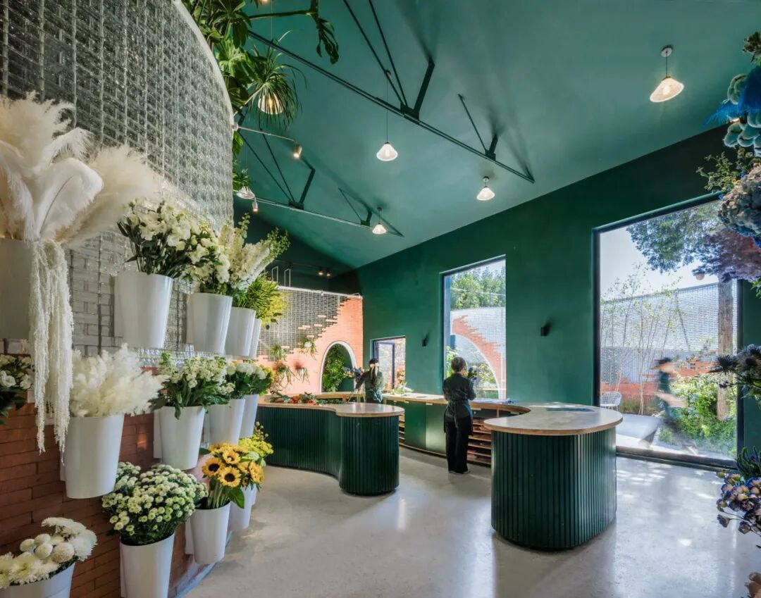 主厅承担对外销售及花艺制作的功能。设计将原有窗洞扩大,形成三大落地窗,不仅使室内花材获得充足的阳光,提供明媚的展示空间,还能够把室内多彩绚丽的鲜花能映射到室外,与室外生机勃勃的庭院景观相互映衬、相得益彰。两层通高的玻璃花墙使顾客可以任意游走于各式鲜花前采购和拍照,诠释只和花“鲜花超市“的品牌定位。二层为绿植展和顾客休息区,客人可在绿意中俯瞰鲜花制作的过程。