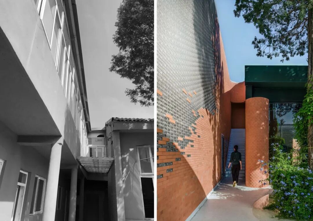 庭院中心保留原有的两棵圆柏,围绕圆柏,在人体视线高度范围内种以观赏性较高的蓝雪,形成一个茂盛蓬勃的景观中心。一面7米高玻璃与红砖组合的墙面作为庭院端景,将展示区与后勤区进行划分。景观水面将这一切融化在朦胧倒影中,洗涤外界烦嚣,灵动了整个庭院。景观选用蒙古栎、白桦等北方特色乔木映衬砖墙,则传达一股清冽而又饱满的,专属于北方大地的生命力。