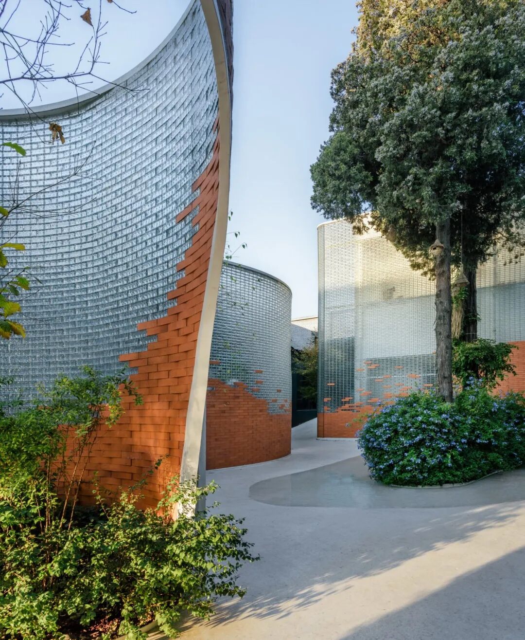 ⊙ 自由流动的曲面砖墙将客人由入口拱门引入