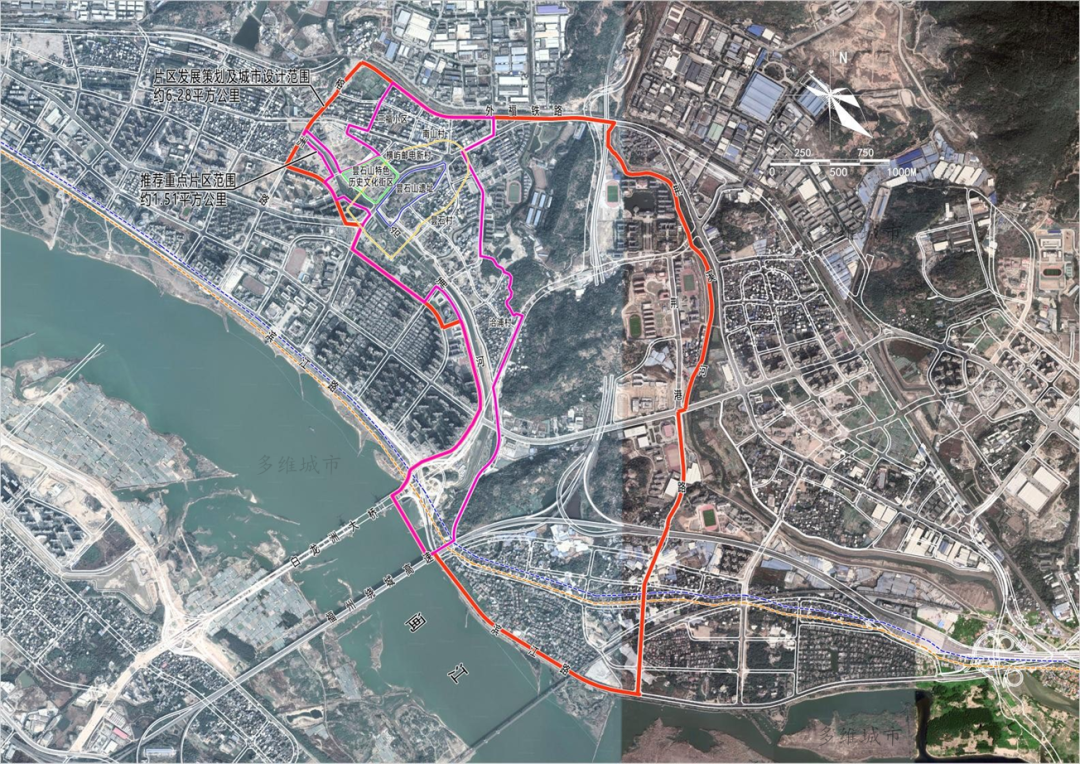 规划范围示意图。片区发展策划及城市设计范围总面积6.28平方公里;推荐重点片区范围1.51平方公里。