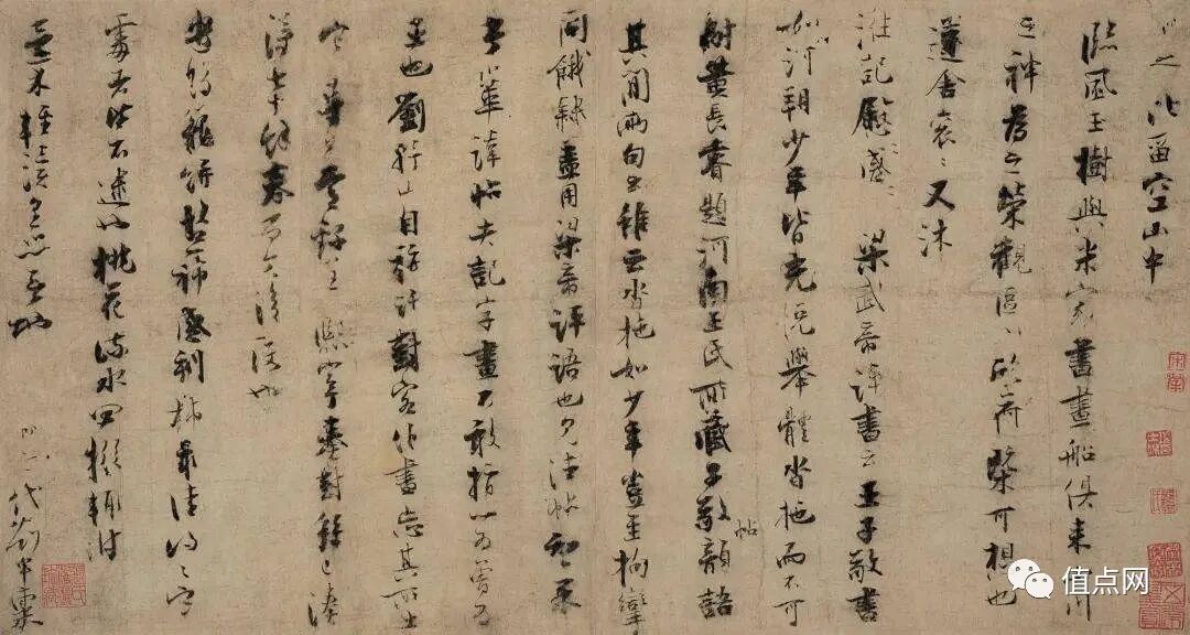 题识:即之比留空山中。临风玉树,与米家书画船俱来,山川之神为之荣观。区区欣荷,概可想也。还舍衮衮又沐囗记,慰感慰感。梁武帝评书云:王子敬书如河朔少年,皆充悦,举体沓拖,而不可耐。黄长睿题河南王氏所藏《子敬帖》韵语,其间两句云:“虽云沓拖如少年,岂至拘挛同饿隶。”盖用梁帝评语也,见法帖智果书。辈讳帖失记,字画不敢指以为曾为王也。刘杼山自称许,对客作书,忘其所出。它日专意录呈熙宁奏对录,已凑得七十余卷,尚欠后段也。遣赐笼饼盐柿。感刻。柿最佳,得之它处者皆不逮也。桃花流水四撰辄附还示,轻渎。皇恐无地。即之代札申禀。