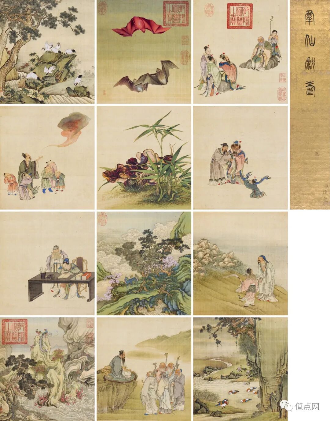 《寿意图册》,素绢本设色画,原为8册,每册为12幅,第4册为10幅,共94页,经《石渠宝笈·初编》和《国朝院画录》著录,内容为: