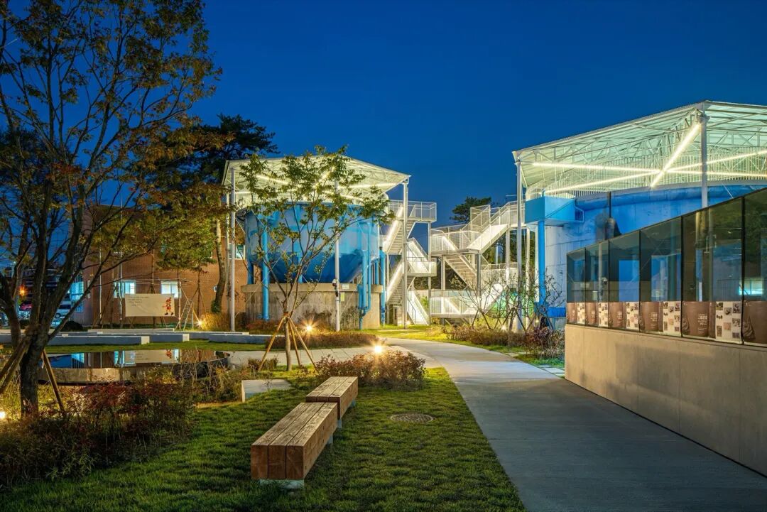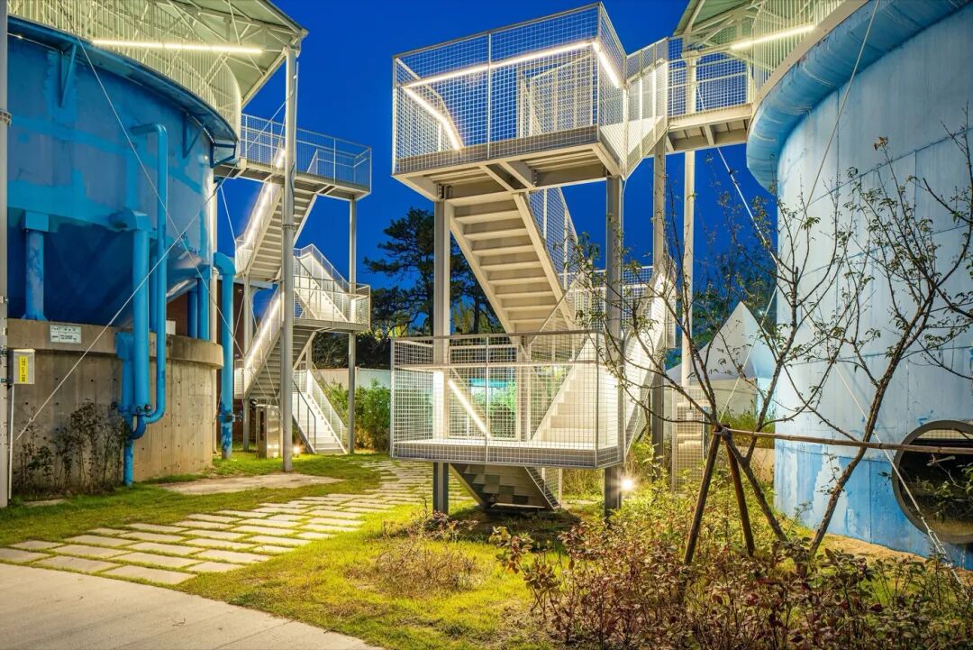鸟致院文化园重新利用了现有设施和连接主要设施的主要人行道,东侧新的线性透明 "欢迎中心 "和北侧现有的净水设施通过地面上的环形人行道相连。净化设施已被改造成一个新的螺旋式展览空间和观景台。