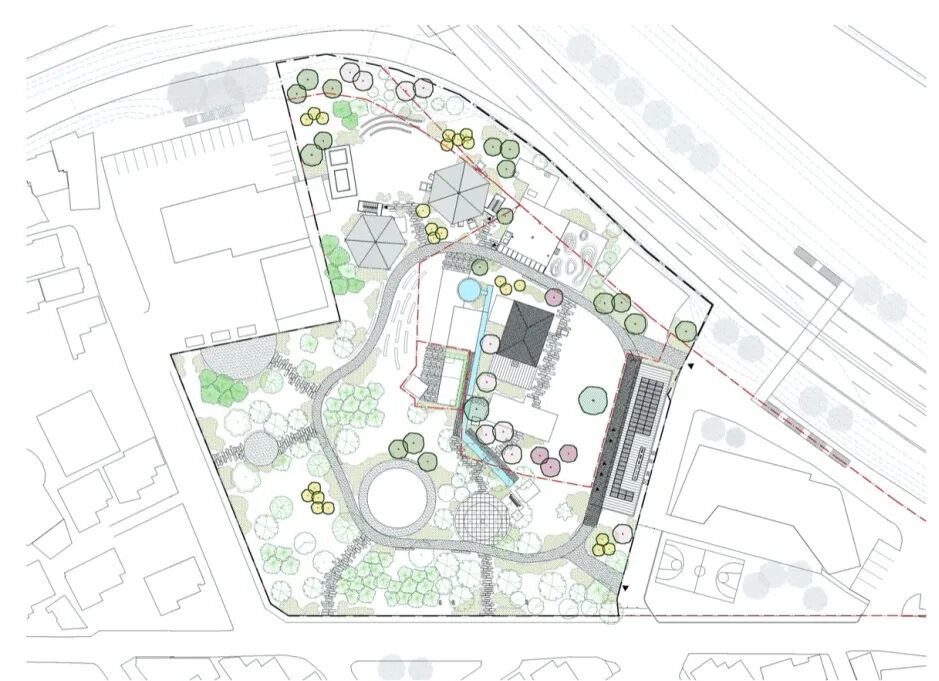 The main goal of landscape design was to re-model the old site into a city garden by integrating a nearby park with the site.
