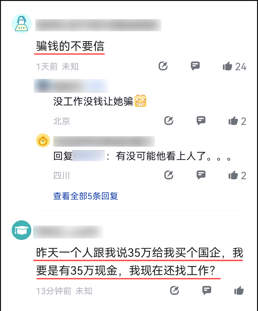 这让我想到以前互联网没那么发达的时候,那时找工作还要靠中介,所以就出现以进国企、拿铁饭碗为由的骗子中介四处收钱。