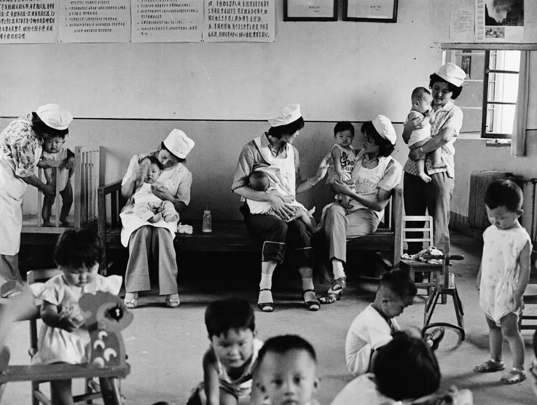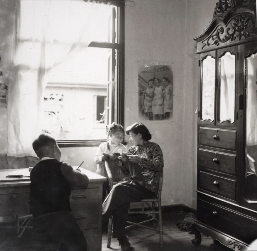 合肥市一户家庭里,边打毛衣边陪小朋友写作业的年轻妈妈,1963年 黄正宜