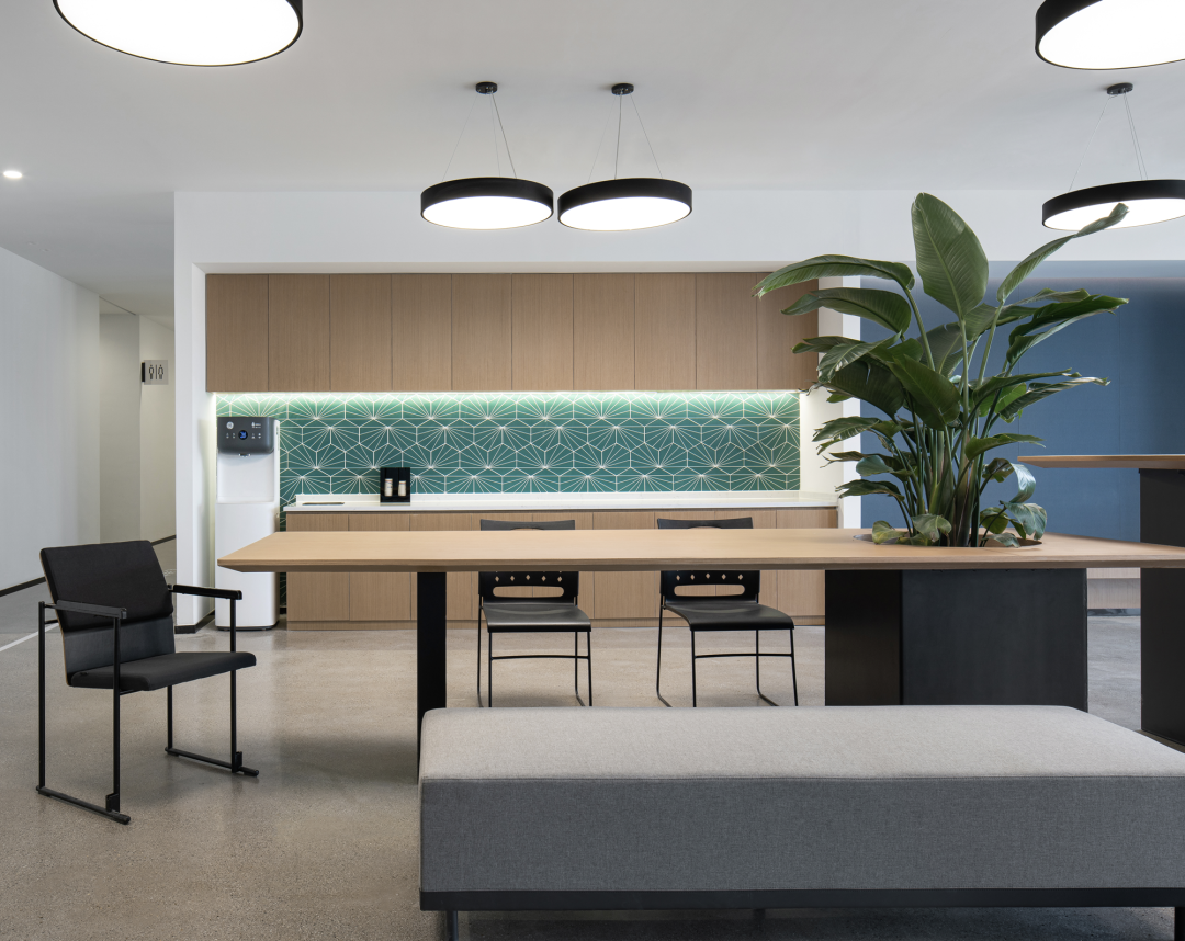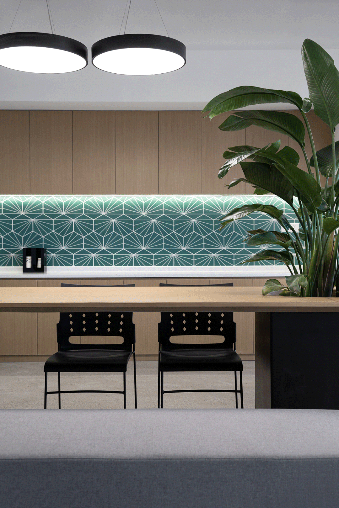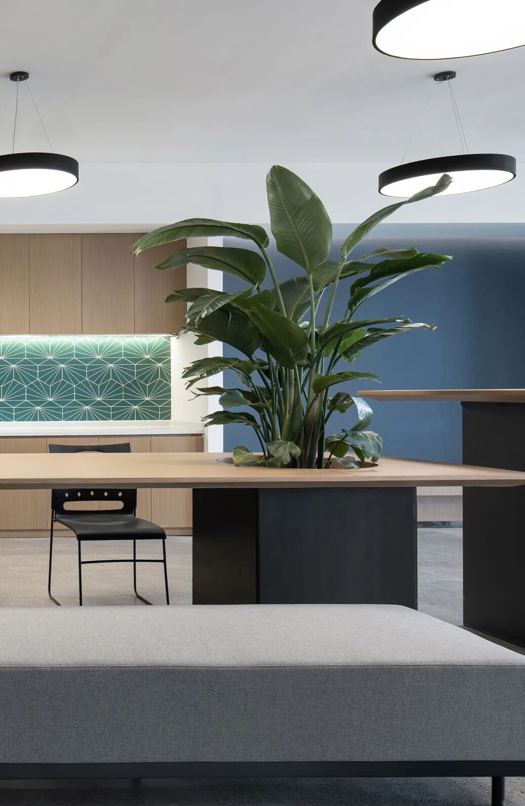 相较于办公区,休闲娱乐空间的自然感元素则更加丰富,通过色彩与植物的碰撞营造积极自然的空间情景增强空间的凝聚与互动场景,这里更像是一片空间的绿洲,为素净的空间带去欢快的绿意。