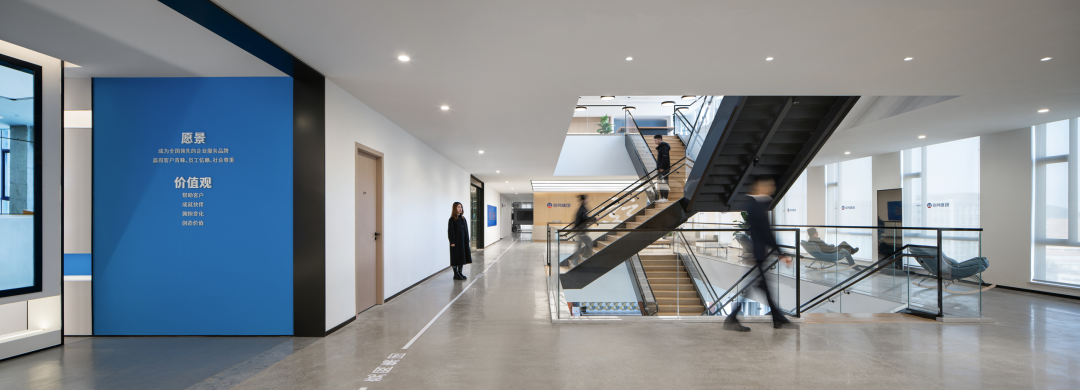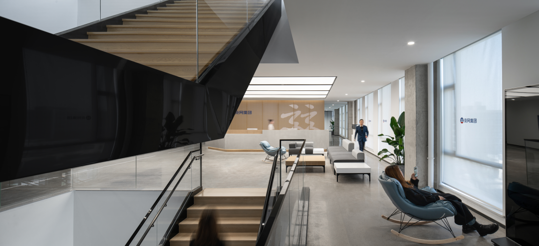 楼板的挑空将9-10层贯穿为一个整体,雕塑感的楼梯作为空间纽带赋予空间向上而生的力量,不仅成为内部之间快速沟通的途径,同时塑造企业空间的记忆标识。