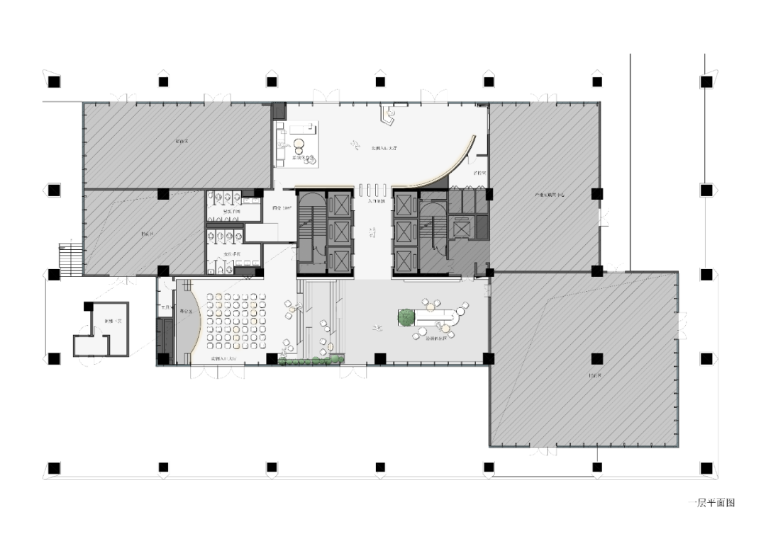 本案建筑共有10层,在功能的划分上,根据业主需求,1层为对外的接待大厅与路演厅,2-6层作为企业联合办公空间以及对外共享空间,集团内部的办公空间和企业展厅则放置在7-10层。
