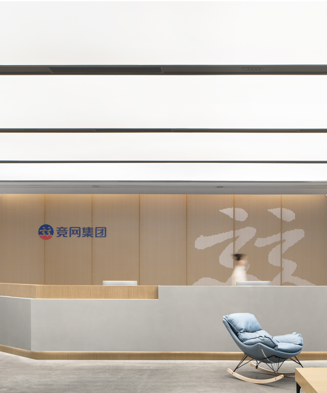 The front desk of Jingwang office is located on the 9th floor. The designer uses the size of the aperture of the wood grain perforated aluminum plate to visually superimpose the bottom light to form a unique corporate background wall. The application of cement board makes the front desk with a business atmosphere return to a natural scene. Create a relaxing and immersive atmosphere.