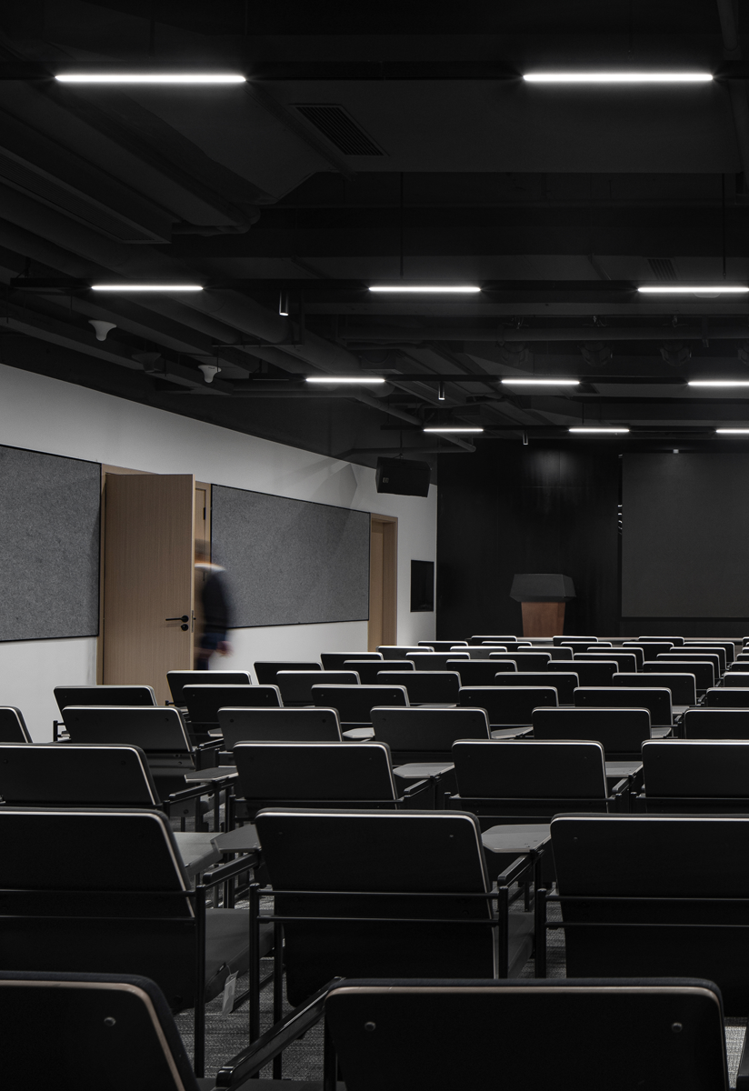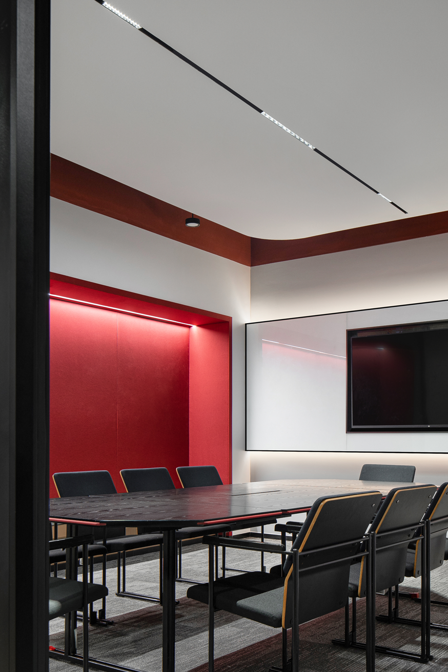 Color defines the division of floors. The theme color system of different floors is used to light up a small collaborative space, so that colors can bring a positive and active thinking field. Large conference space is relatively restrained, dark ceiling with linear light source, simple space to express the immersive conference atmosphere, let people into the space, return to calm.