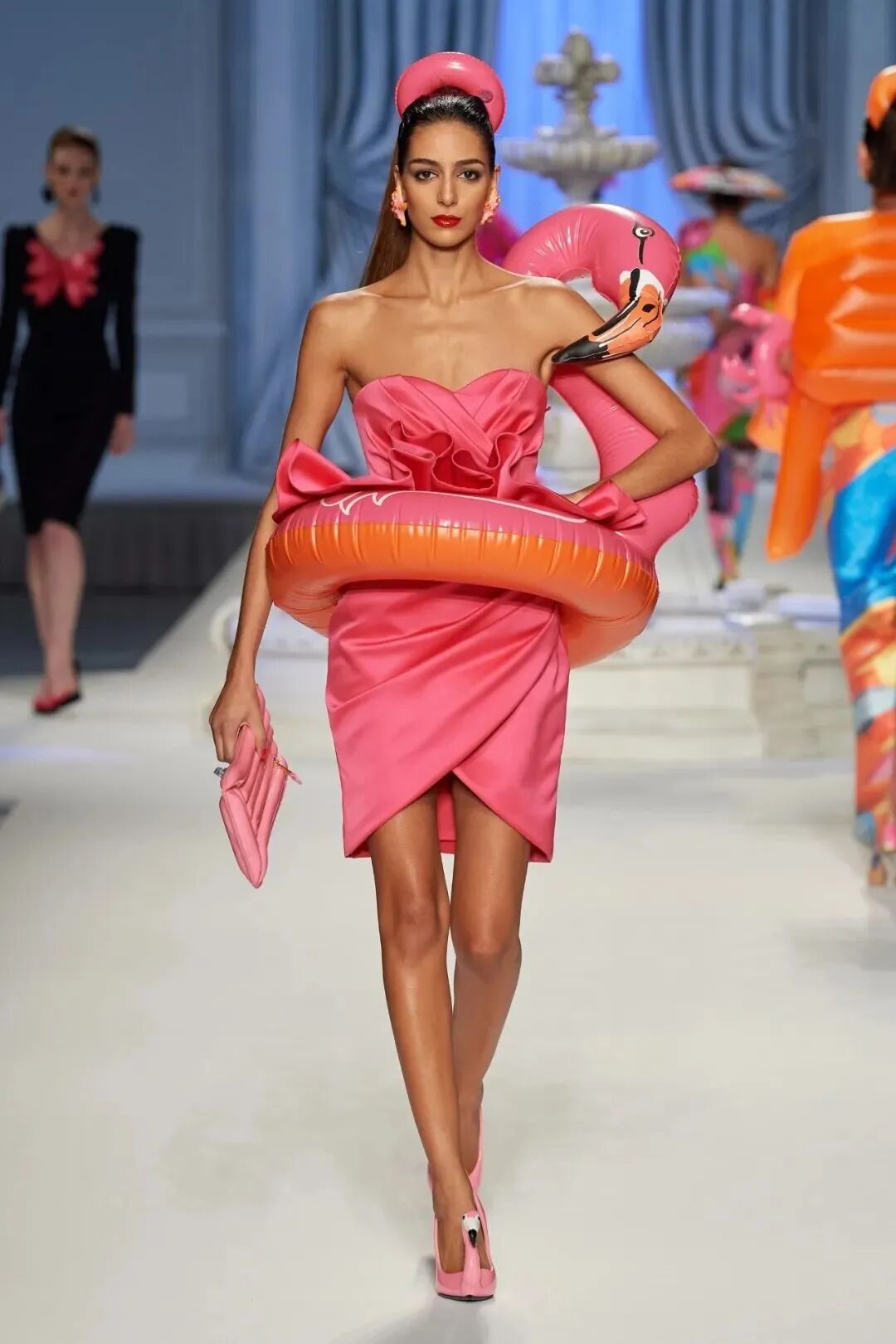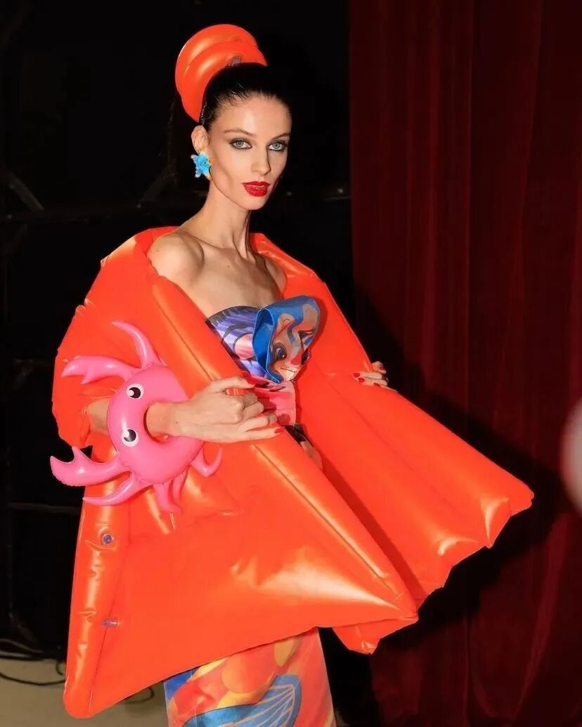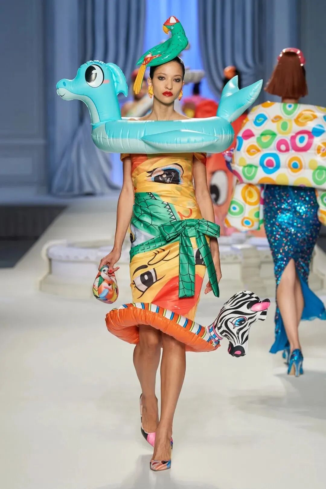 Jeremy Scott将充气的气球作为配套元素——救生衣、游泳圈、浮床、漂浮玩具穿到身上,搭配卡通动物等元素和鲜艳的色彩,华丽、可爱又有趣。