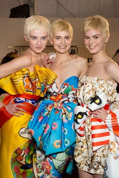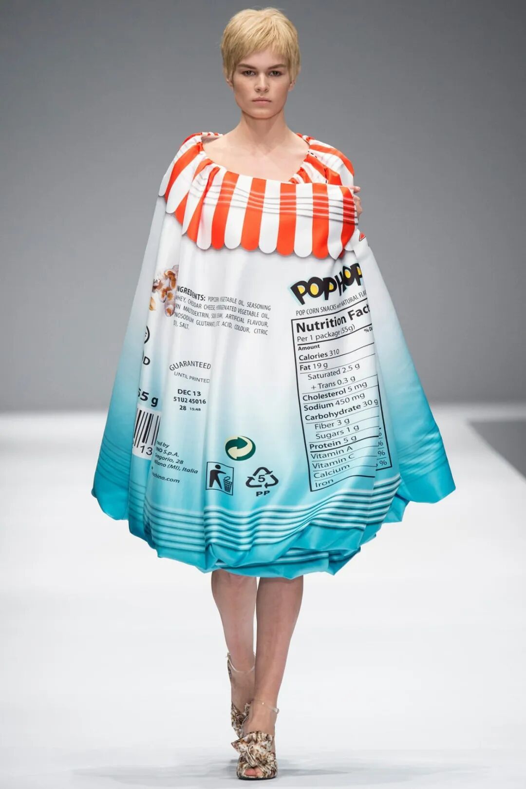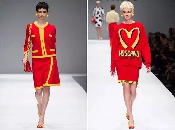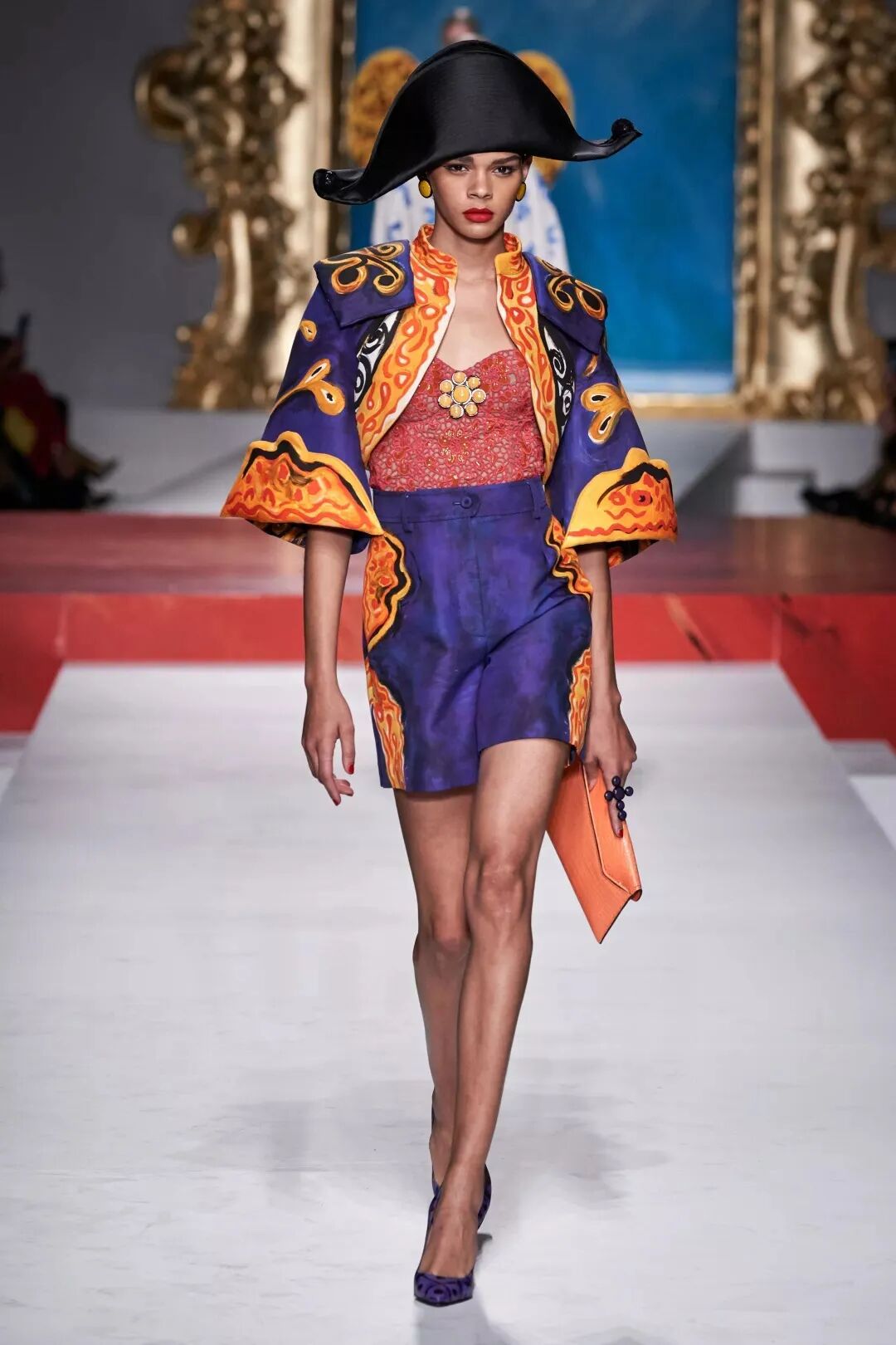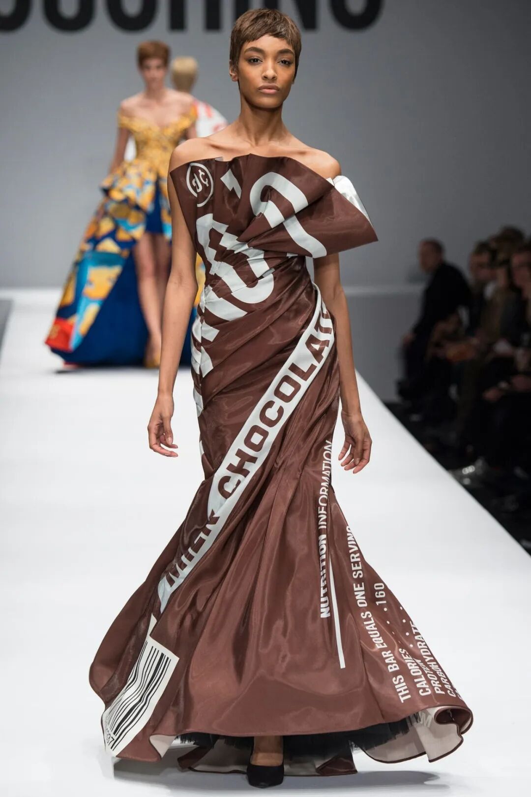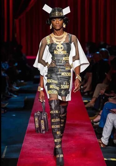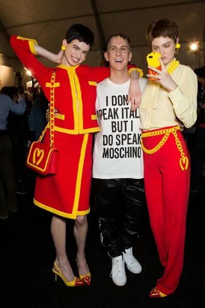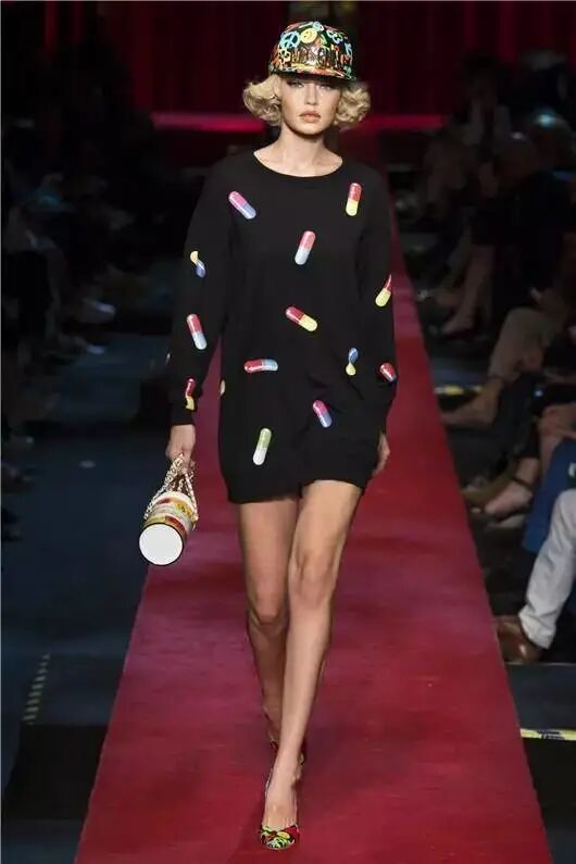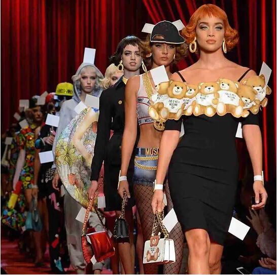 在 MOSCHINO 掌舵的首季,他将焦点聚焦在美国消费主义,将薯条、巧克力棒、糖果、玉米棒包装的设计加入服装上,甚至连卡通海绵宝宝也欢乐登场,打造“具有讽刺意味的后现代波普幽默”的时装秀场。