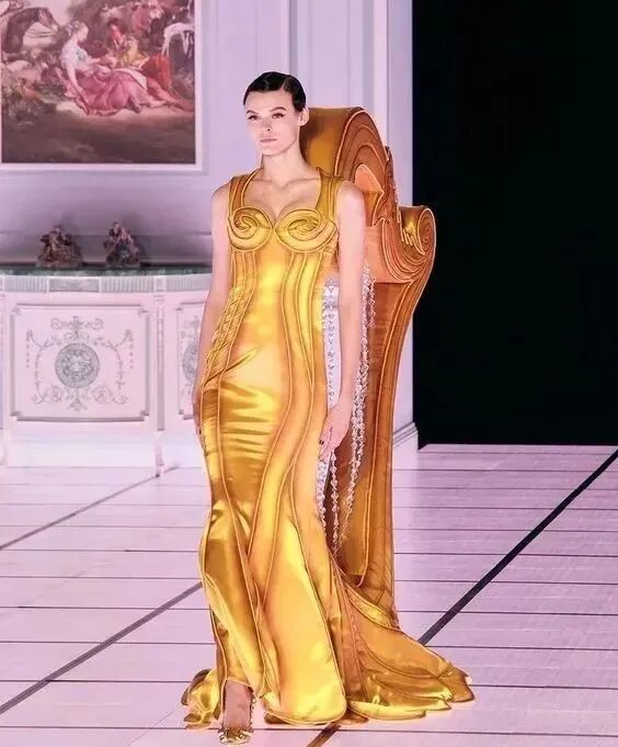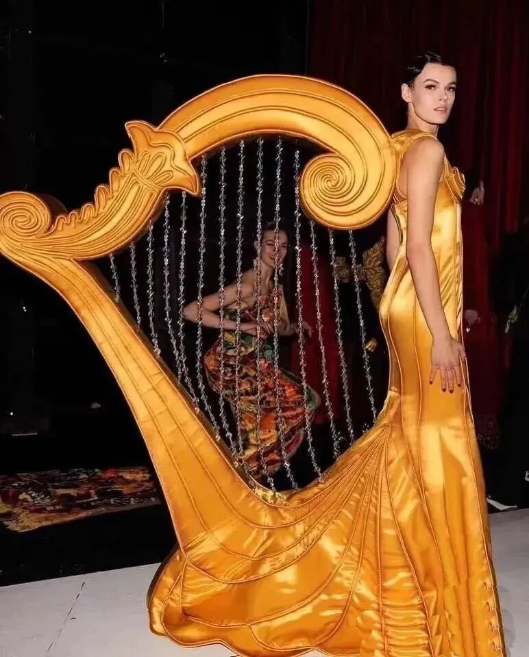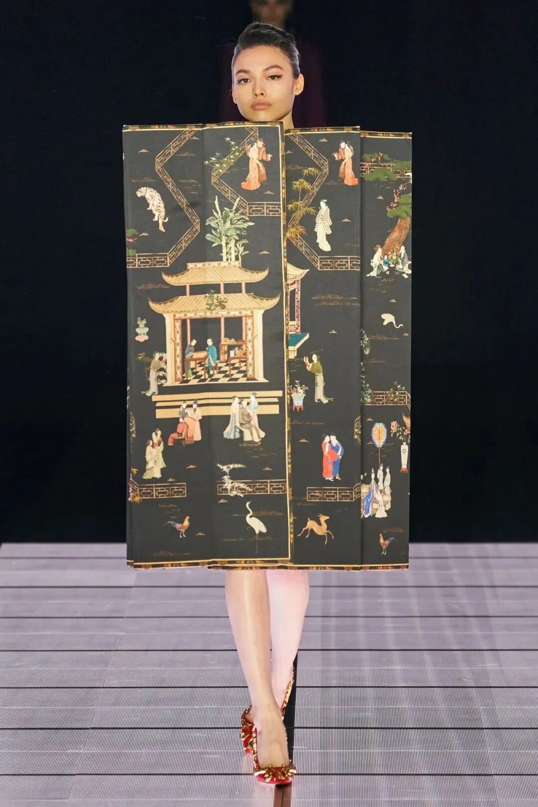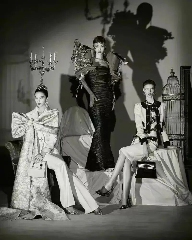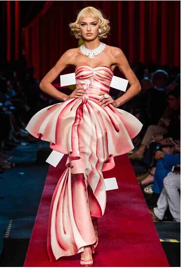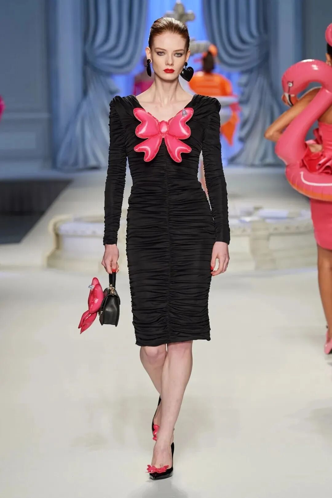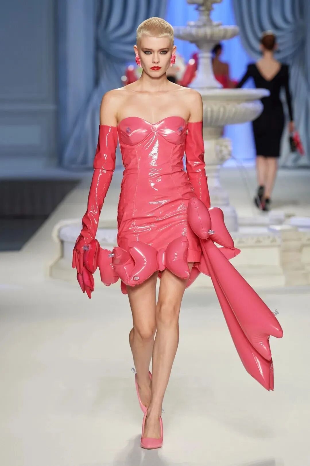 这场秀大量采用三维印花,印上了所有的服装款式,还有新潮的胶囊印花,以及首饰。品牌标志性泰迪熊外套变成了 2-D 装饰,盛大的晚礼服上有平面模仿性感的蝴蝶结和褶皱,不得不感叹鬼马设计师的天马行空创意。