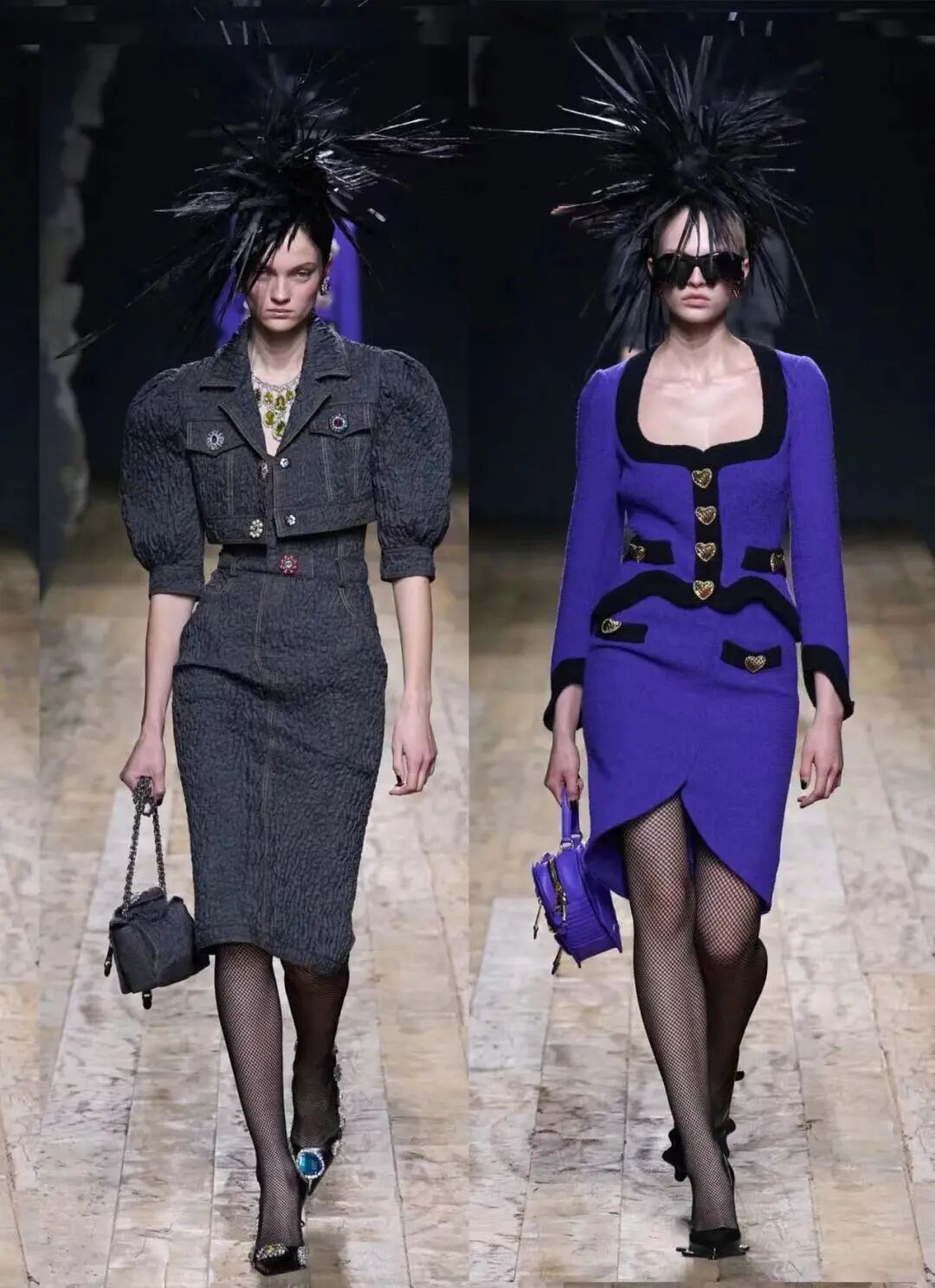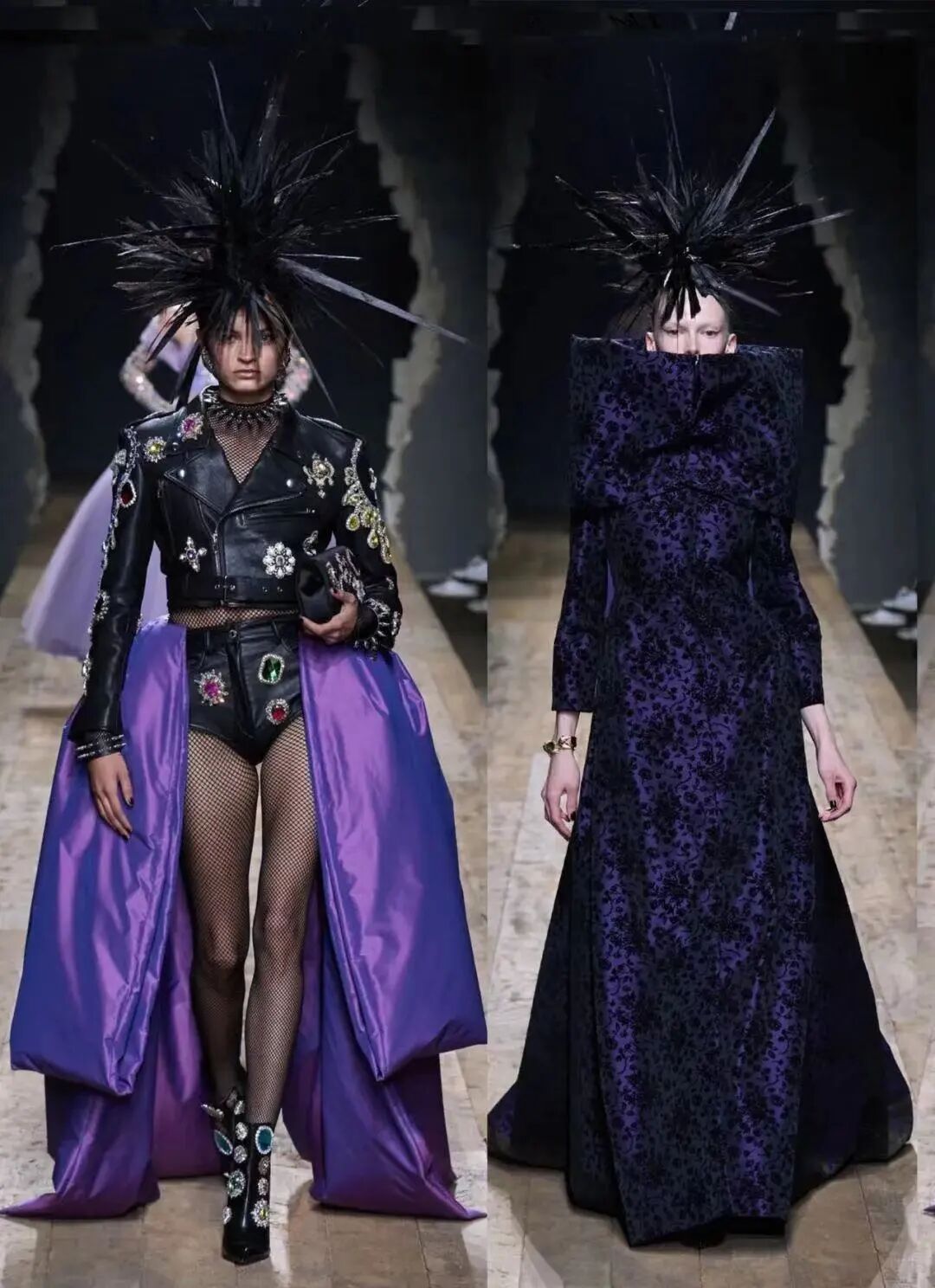 灵感来源于达利的经典作品《记忆和永恒》“融化时钟”,开场带有软化扭曲的下摆和边缘裙装和针织连衣裙,千鸟格纹图案被扭曲和软化,还有花卉图案从他们合身的前纽扣连衣裙的帆布上渗出。搭配夸张的发型整个系列怪诞有趣。其中标志性的朋克元素则是向Vivienne Westwood的致敬!