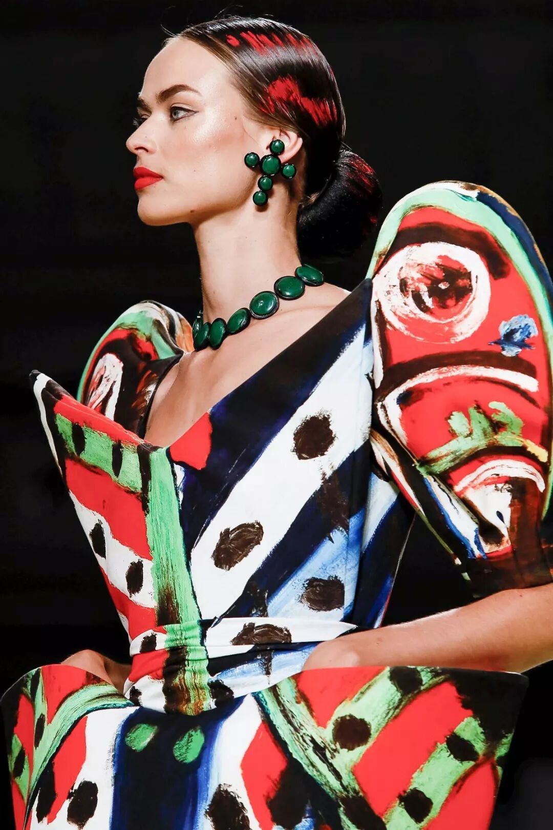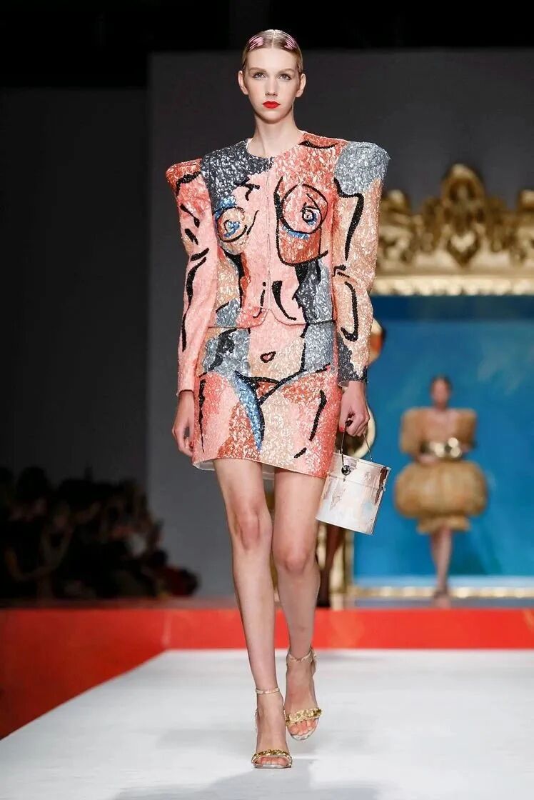 MOSCHINO 2020春夏系列中,Jeremy Scott同样以2D-3D平面转换的视觉冲击,让模特仿佛成为了画家手中五彩缤纷的"调色盘",将毕加索的经典绘画作品穿在身上,不少名画的图案素材以印花刺绣、立体的裁剪的形式出现在系列中献上了一场华丽的梦幻变装秀。
