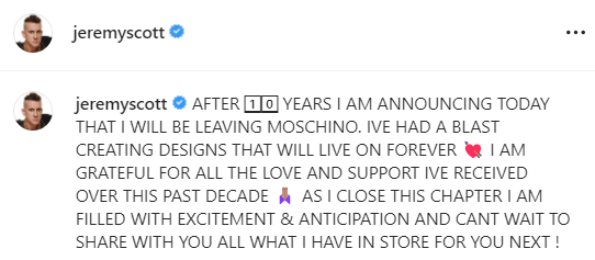 3月20日,惊闻MOSCHINO 宣布 Jeremy Scott 正式卸任品牌创意总监,整个时尚圈大为震惊,随后 Jeremy Scott 在自己的社交账号上也证实了这一消息。