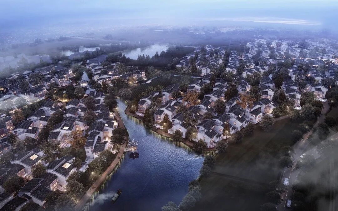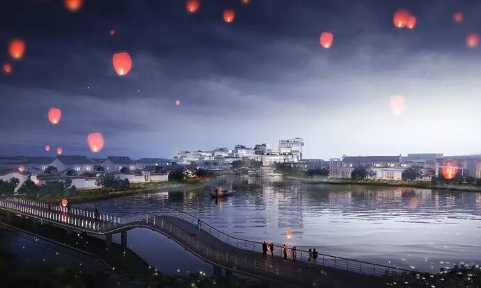 对自然水体、绿化植被的刻画,以及对天光的把控,均是服务于这个核心。暮霭沉沉中,华灯初上,炊烟袅袅,观者隐约听到了人语鸟鸣,静止的画面流动了起来。此时此刻似有人在你耳畔低语念白,仿佛是一首田园诗向你娓娓道说这氤氲的水乡情。