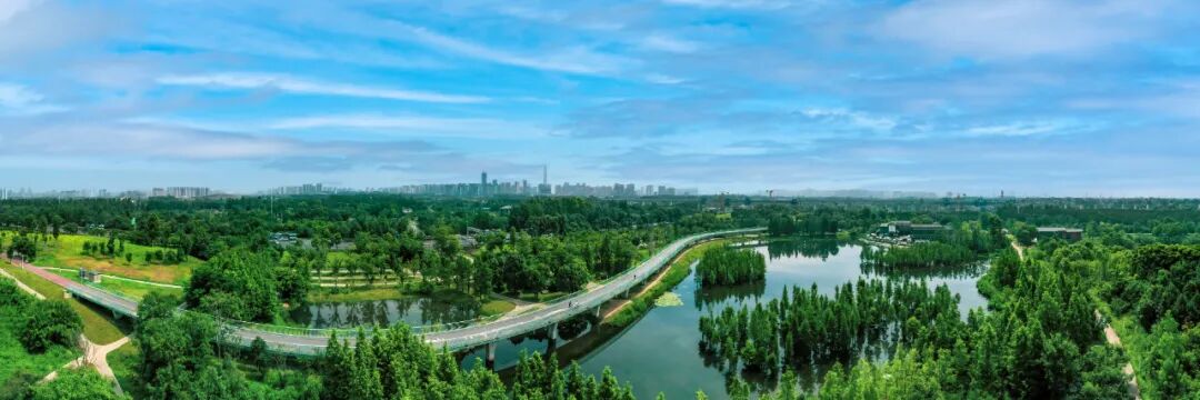 搭乘专属摆渡车穿行于万亩公园之中,满眼青绿,空气清新,远处是高楼勾勒的城市天际线,金融城双塔、在建的蜀峰468清晰可见。