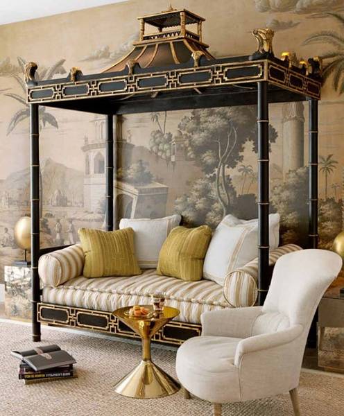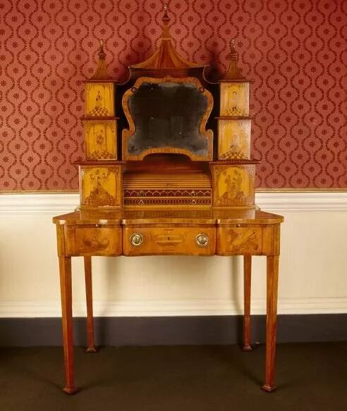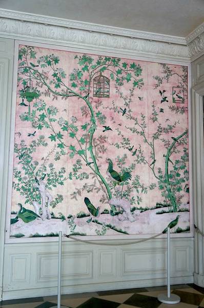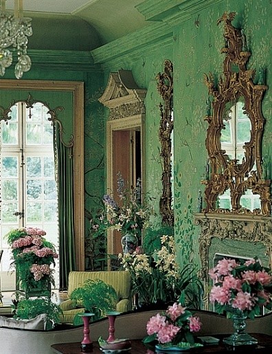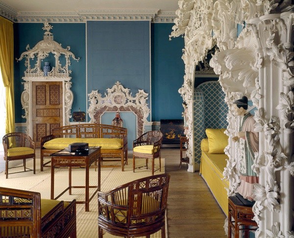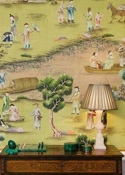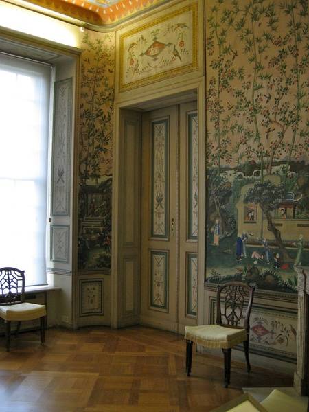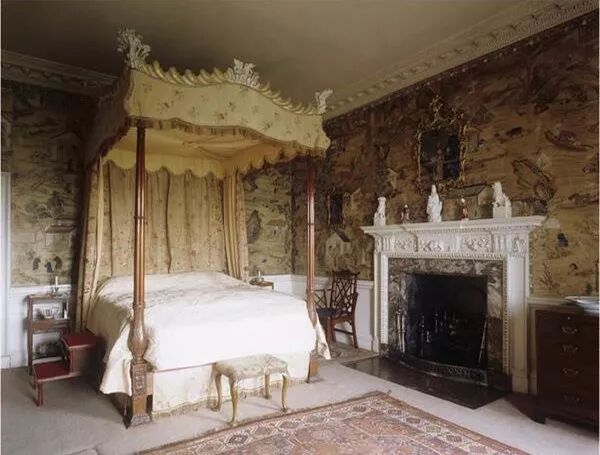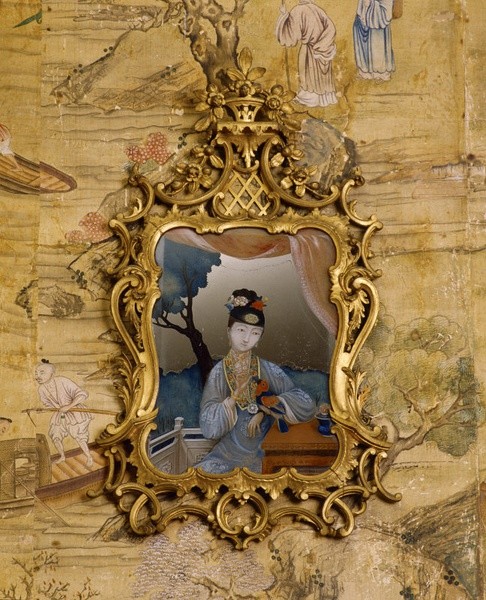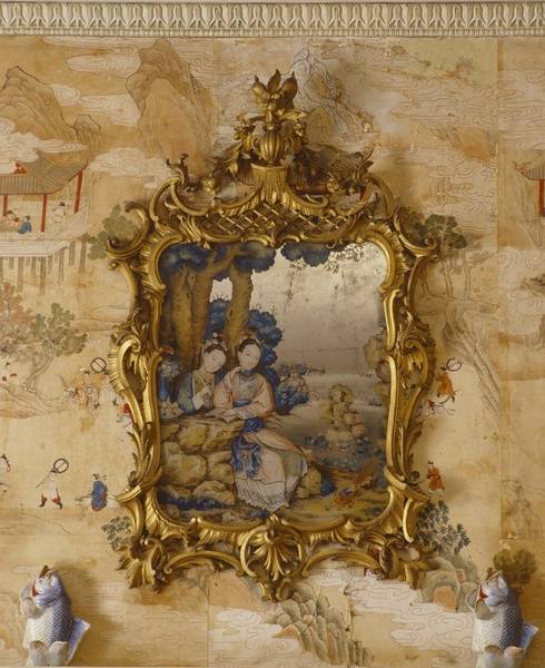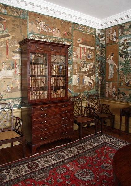 齐本德尔的卧室有一个全景“壁纸”,事实上是一幅画中,描绘了不同行业形形色色的人们。18世纪中叶,中国画被装饰在玻璃上、墙壁上,镂空椅子、壁柜架子上,进一步提高了房间的异国风情。
